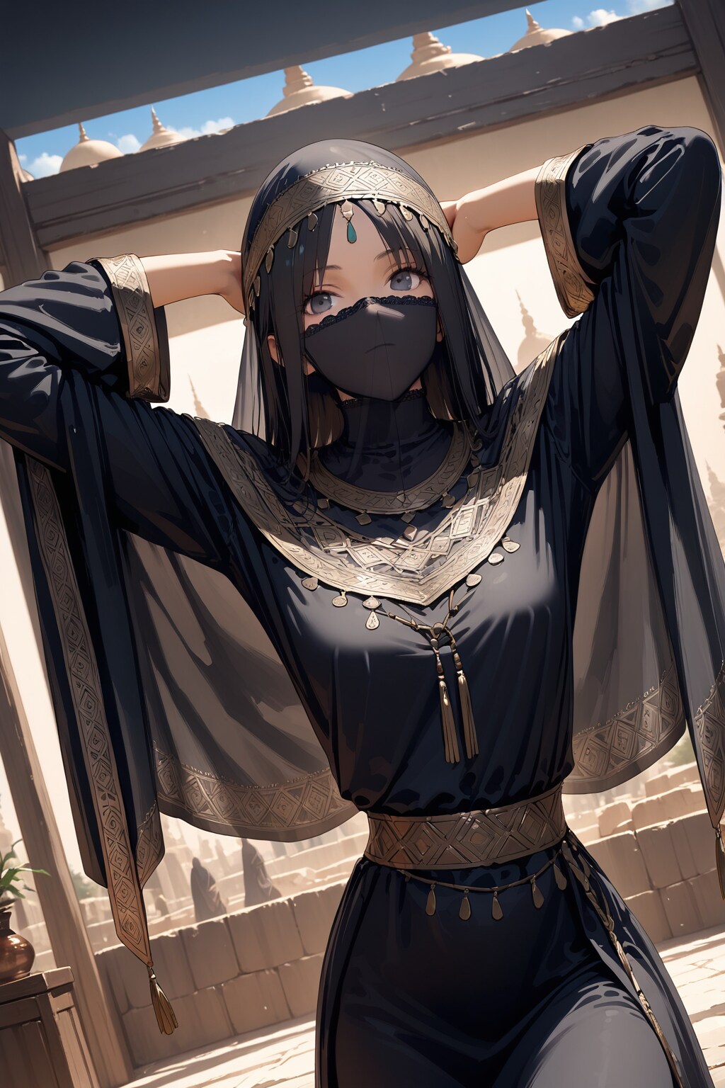 アバヤは、イエメンを含む中東地域で女性が着用する伝統的な長くてゆったりした黒いローブで、暖かい気候に適した軽量な生地で作られ、縁に刺繍が施されることが多いです。ニカブは顔を覆うベールで、目だけが見えるように設計されており、文化的・宗教的な理由から使用されます。