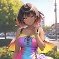 カラフルな虹色のワンピース姿のカナちゃん