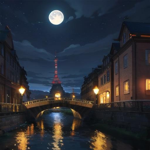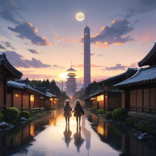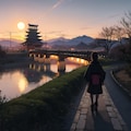moon and bog, far distance: small 1girl silhouette walking along riverside path, sunset, bridge and tower, decadent, masterpiece, winter japanese countryside landscape, panoramic view, cyberpunk
