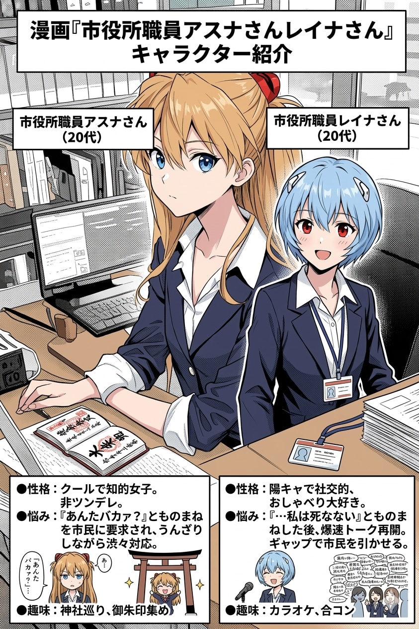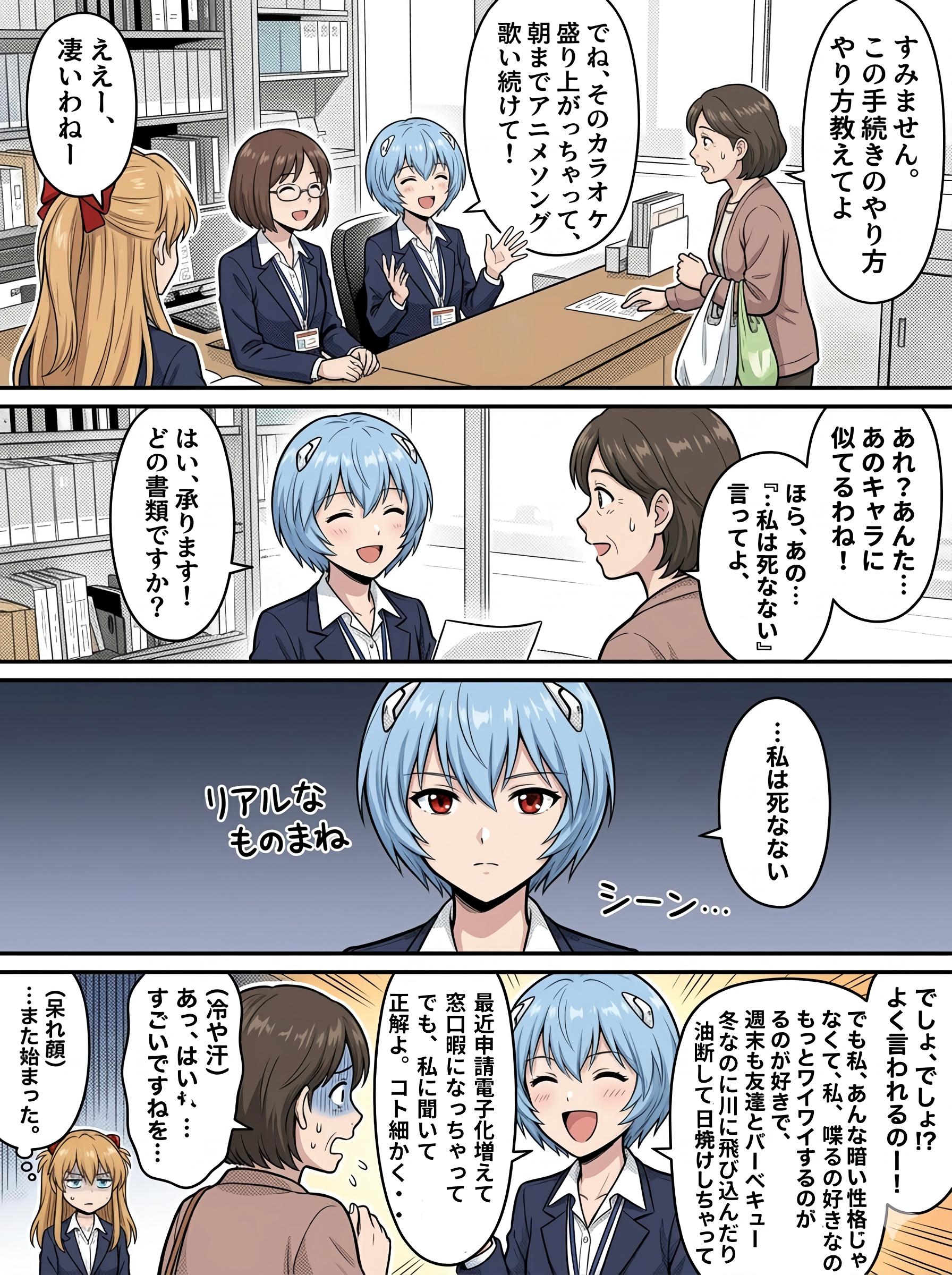 うちの子と言っていいのか微妙ですが、元ネタはもちろん国民的アニメのキャラです。実は同人漫画を昔作りたいと思ったことがあり、エヴァキャラが一般人として働いていたら面白いなという構想がありました(似たような同人誌を見かけたことはありますが・・)。当時私の画力がなくアイデアだけで終わってしまいましたが、こうしてAIの力を使って制作してみました。当時はアスナさんはツンデレキャラはそのままにしていたのですが、今回からクールな知的でツンデレキャラを無くしてみました。