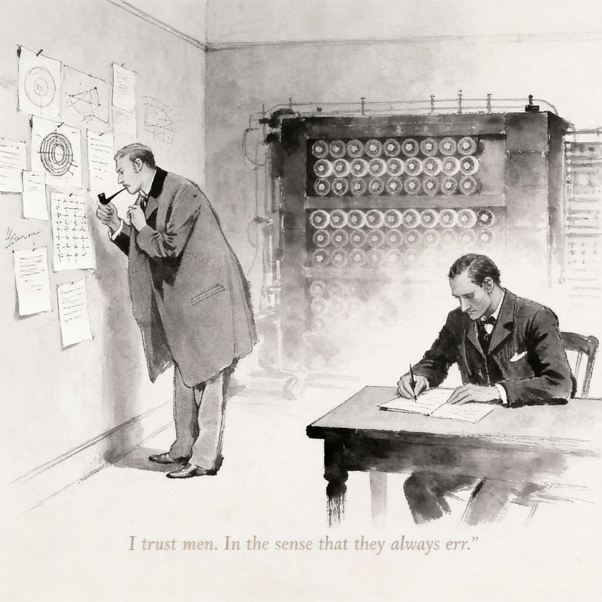 「癖は暗号機の中に入る」ホームズは遮った。「入力されるからね。君が機械を信じるのは自由だ。私は人間を信じている。彼らは常に過ちを犯すという意味で」