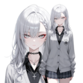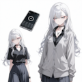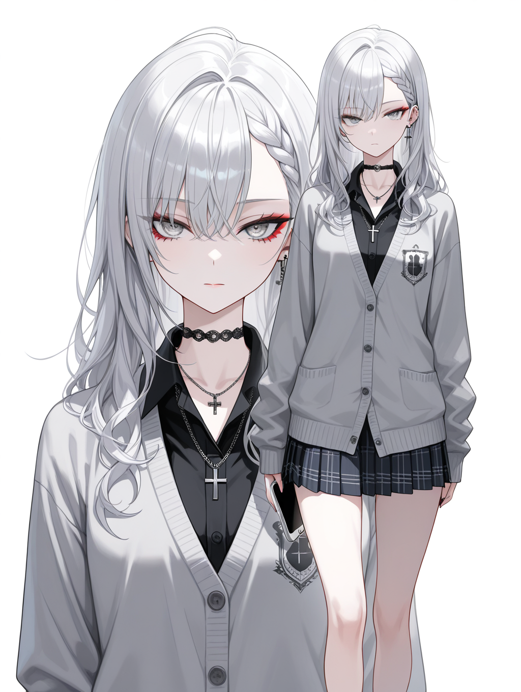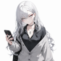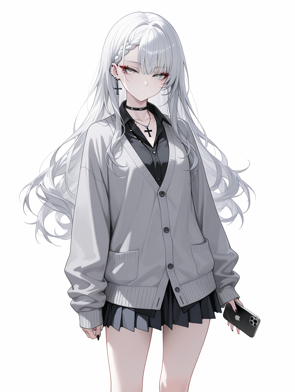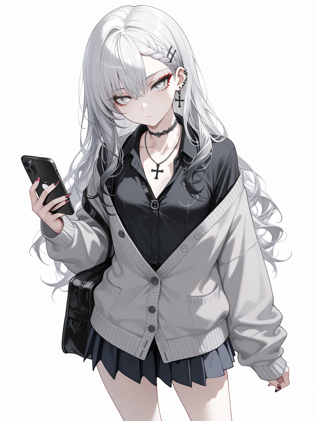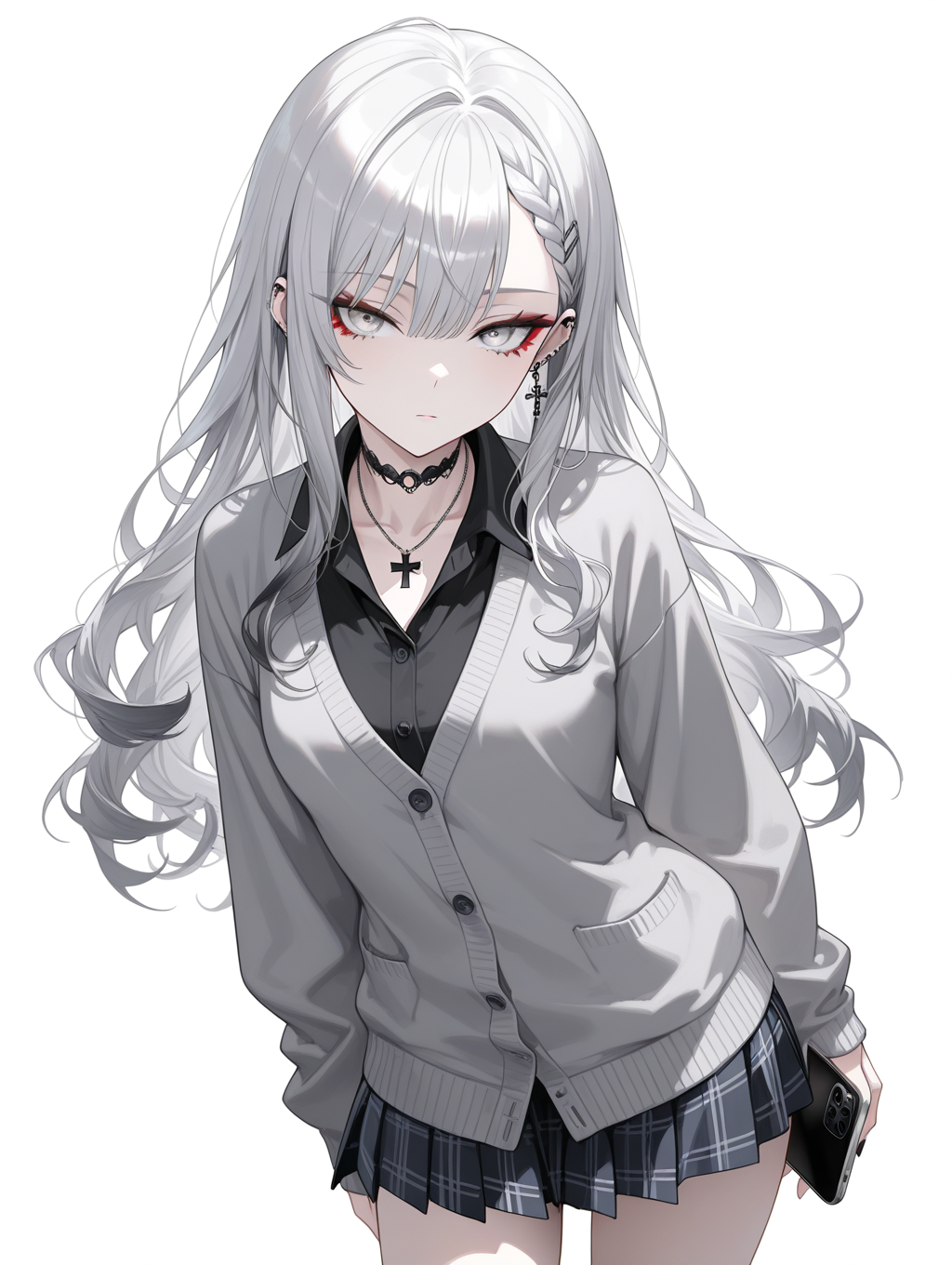 collared_shirt,black_shirt,gray cardigan,untucked_shirt,skirt,school uniform,have a iPhone,