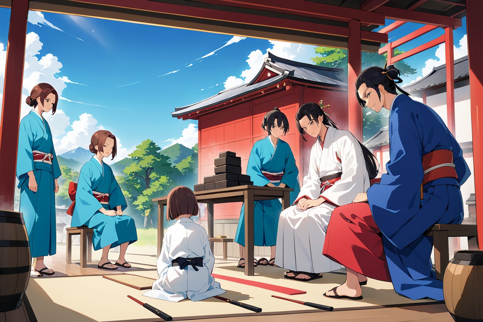 青空に白い雲が浮かび、遠くの山々と緑の木々が広がる、穏やかな日本の寺の一室。畳の上に正座する少女は、じっと前を見つめていた。黒髪のボブがかすかに揺れ、白い着物の袖が膝の上で静かに折り重なっている。