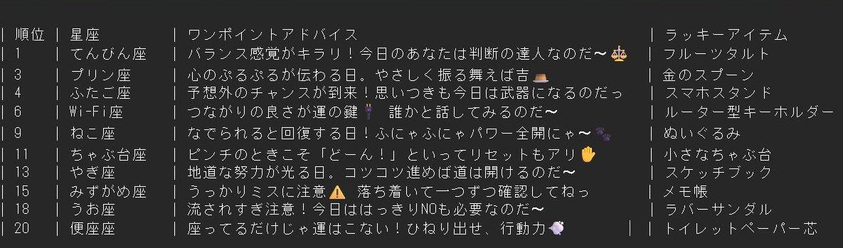 チャトピちゃん占い05/15 2025/05/14 使用したAI ChatGPT #チャトピちゃん占い 毎日お昼ごろに明日の運勢をお届けっチャトピちゃん占いー 呪文 入力なし ねこなみさくら 8,814 投稿 フォロー 1,036 フォロワー 1,137 ねこなみさくらは下記が好きな方に効果があります猫/メイドさん/猫耳/ろりっ子/謎な物/くすっとしたい/日替わり画像投稿量が多いのでホームの閲覧がお勧めです呪文やネタの利用はご自由にーR-15・18もー生成用?自作診断メーカーまとめhttps://www.chichi-pui.com/posts/824ee8bb-e261-4f91-bb51-afb6142bc12b/ ねこなみさくらさんの他の作品 ねこなみさくらさんの他の作品 たてよみした ねこなみさくら チャトピちゃん占い(12/17) ねこなみさくら きょうのオムライス(12/16) ねこなみさくら てててー、てってててー(12/16) ねこなみさくら まだ売り切れ中 ねこなみさくら たてよみした ねこなみさくら チャトピちゃん占い(12/17) ねこなみさくら きょうのオムライス(12/16) ねこなみさくら てててー、てってててー(12/16) ねこなみさくら まだ売り切れ中 ねこなみさくら ほんとこうすればいいのになぁと ねこなみさくら