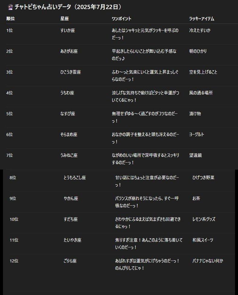07/22のチャトピちゃん占い 2025/07/21 使用したAI ChatGPT #チャトピちゃん占い 明日の運勢をお届けーチャトピちゃん占いー 呪文 入力なし ねこなみさくら 8,810 投稿 フォロー 1,034 フォロワー 1,135 ねこなみさくらは下記が好きな方に効果があります猫/メイドさん/猫耳/ろりっ子/謎な物/くすっとしたい/日替わり画像投稿量が多いのでホームの閲覧がお勧めです呪文やネタの利用はご自由にーR-15・18もー生成用?自作診断メーカーまとめhttps://www.chichi-pui.com/posts/824ee8bb-e261-4f91-bb51-afb6142bc12b/ ねこなみさくらさんの他の作品 ねこなみさくらさんの他の作品 たてよみした ねこなみさくら チャトピちゃん占い(12/17) ねこなみさくら きょうのオムライス(12/16) ねこなみさくら てててー、てってててー(12/16) ねこなみさくら まだ売り切れ中 ねこなみさくら たてよみした ねこなみさくら チャトピちゃん占い(12/17) ねこなみさくら きょうのオムライス(12/16) ねこなみさくら てててー、てってててー(12/16) ねこなみさくら まだ売り切れ中 ねこなみさくら ほんとこうすればいいのになぁと ねこなみさくら