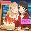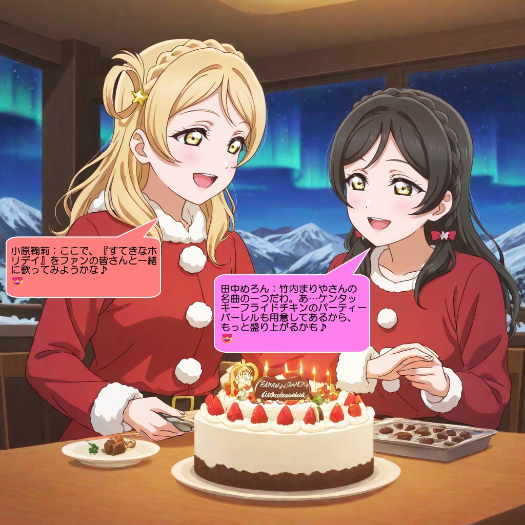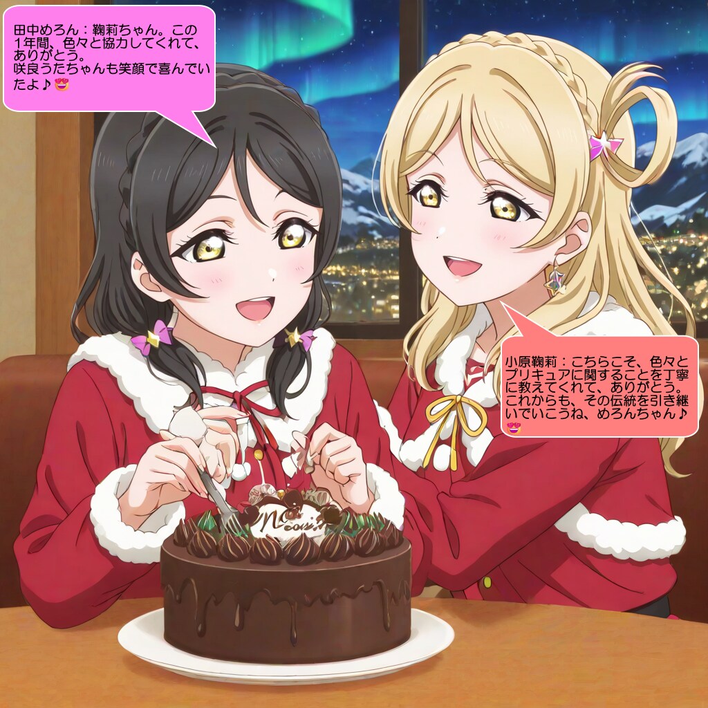 今回は、田中めろんと小原鞠莉がファンの皆様に、チョコミント入りのクリスマスケーキをプレゼントして喜ばせるシーンを描いてみました。