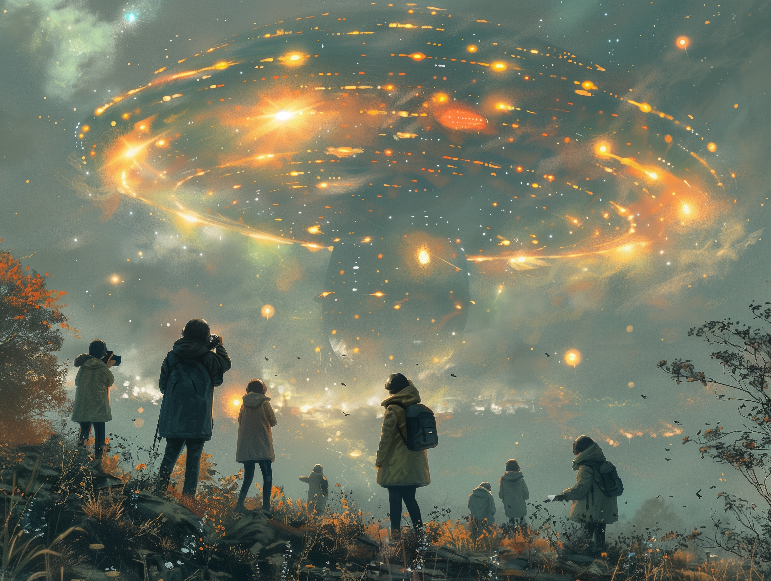 the realistic illustration of Numerous people photographing space alien family , --ar 4:3 --stylize 1000