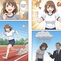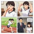 プロンプトコーナー。はい、今回はコテコテの4コマ漫画風で行きました。「陸上の記録を伸ばしたい彼女、一粒300メートルと謳われるグリコのキャラメルを食べてみます。元気モリモリになって走る彼女、でも、結果はドーピング行為と注意を受けてショゲる彼女...」というコテコテの極みの内容です(汗...