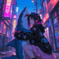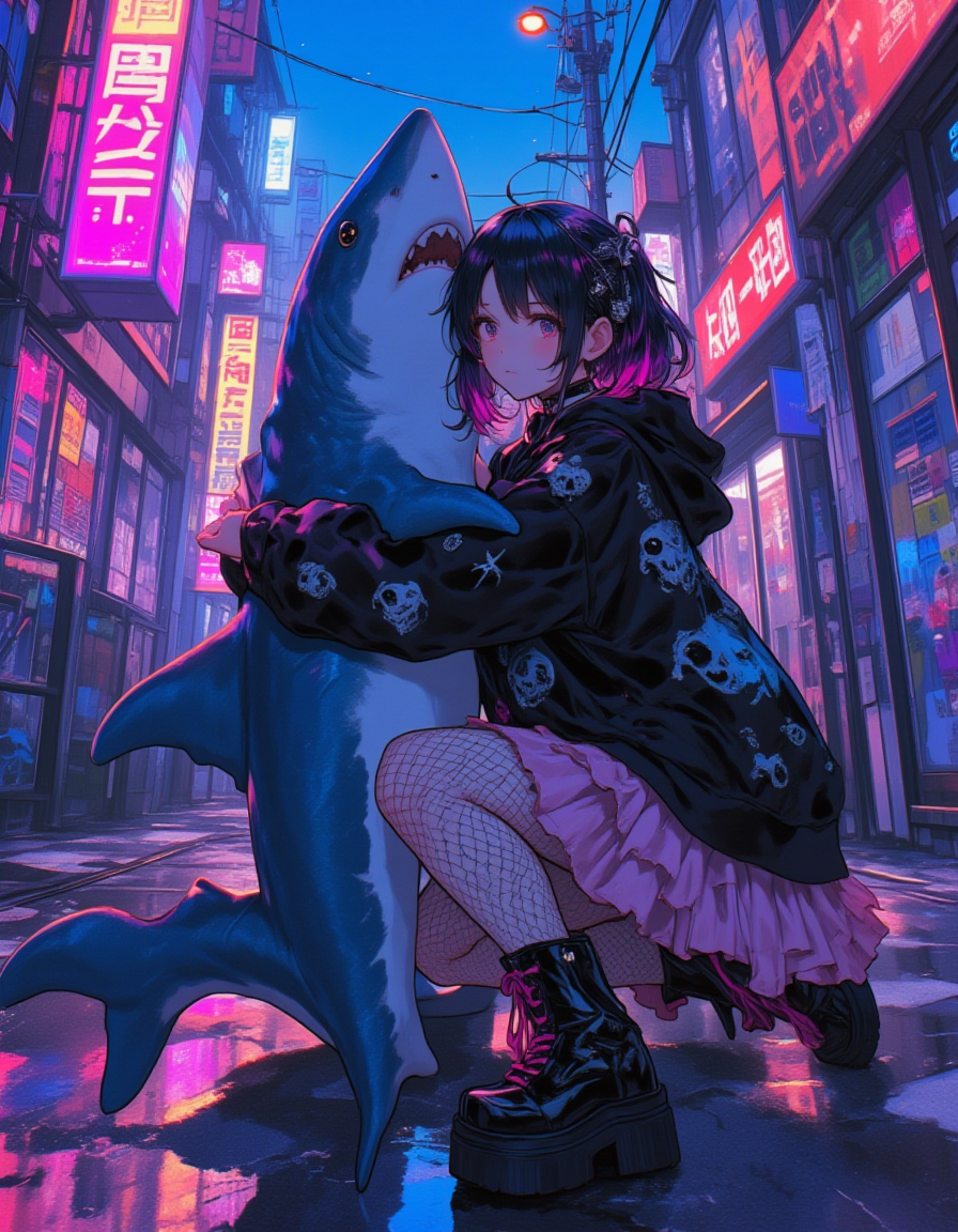 A gritty yet enchanting urban street scene at dusk,capturing a playful yet defiant 23‑year‑old girl in mine‑kei fashion,crouched on damp pavement as she tenderly cradles a massive shark in her arms. She wears an oversized black hoodie adorned with gothic skull and rose decals,draping loosely over a frilly pastel pink skirt that flutters lightly. Her fishnet stockings climb up her legs,ending beneath chunky black platform boots with hot pink laces. Around her neck is a black velvet choker with a silver heart pendant that catches the neon glow. Her dark hair,highlighted with streaks of pastel pink,is clipped with multiple decorative hairpins: tiny stars,skulls,and safety pins. She leans slightly forward,one knee bent on the wet ground,as if seeking balance while holding the shark’s sleek,silvery body close—its glistening scales contrasting against her soft fabrics. The city alley behind them is alive with neon signs in electric blue and purple,casting vibrant reflections on puddles. The walls are layered with colorful graffiti tags and torn concert posters fluttering in the breeze. Faint streetlights add a warm haze in the distance. The focal point is this intimate,surreal moment: a bold young rebel and an enormous shark united in an embrace. The textures—wet pavement,fishnet,slick shark skin—are rendered in ultra‑detailed anime style,with crisp linework,soft shading,and high‑contrast lighting that heightens the emotional,cinematic mood.,
