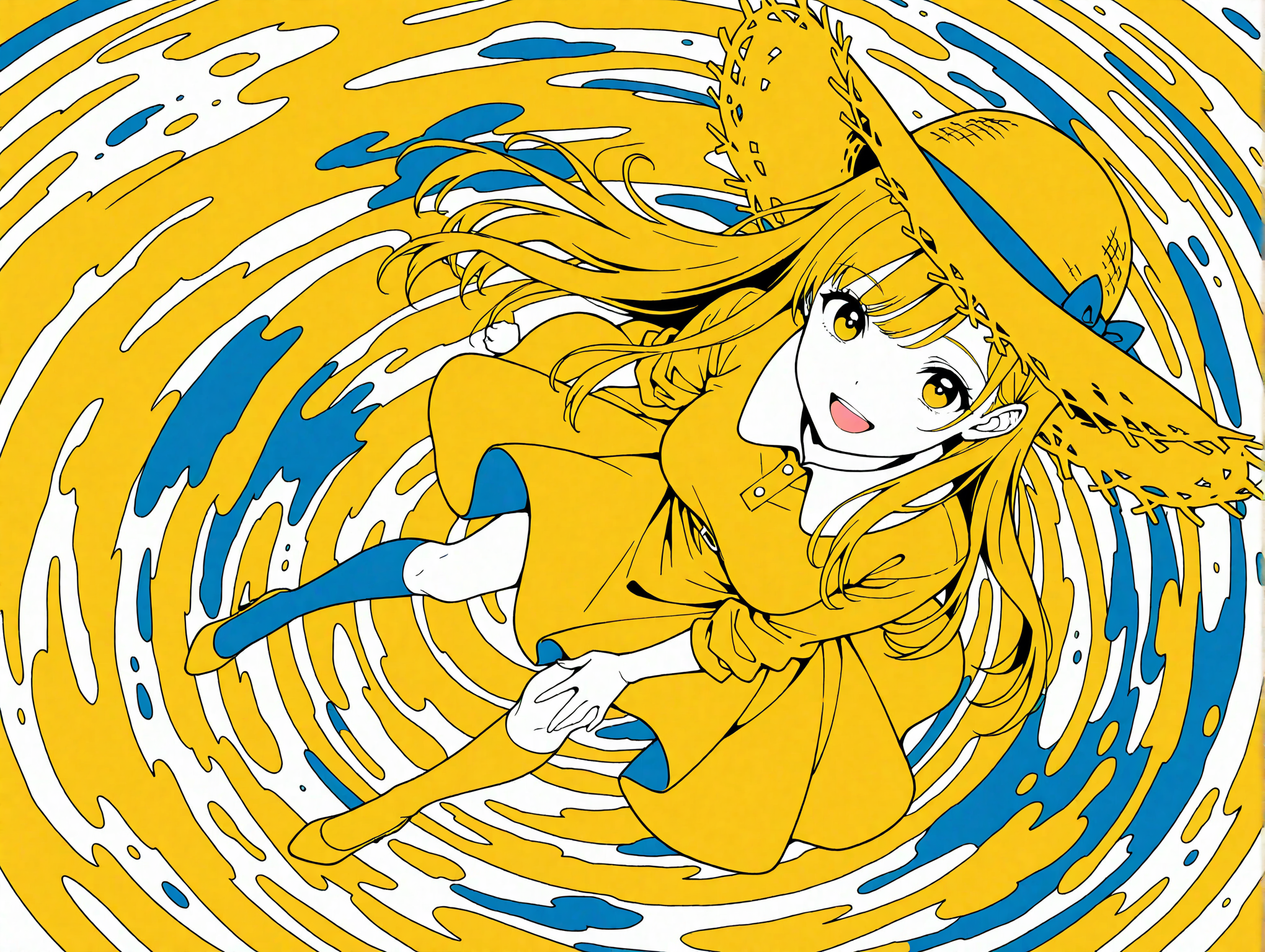 masterpiece,best quality,amazing quality, blue and yellow theme, lineart, (flat color:1.3), limited palette, soft-edged, (watercolor:0.4),(pastelcolor:0.4),pastel hues, Colorful ink painting, (ink painting:1.3), 1 girl, solo, 16 yo, blonde straight hair, bule eyes, good style, medium breasts, smile, open mouth BREAK