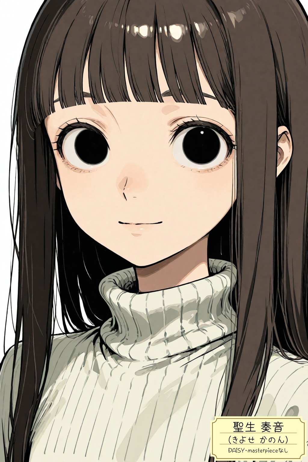 long hair, dark brown hair, blunt bangs, black eyes, round face, wide-set eyes, flat chest