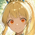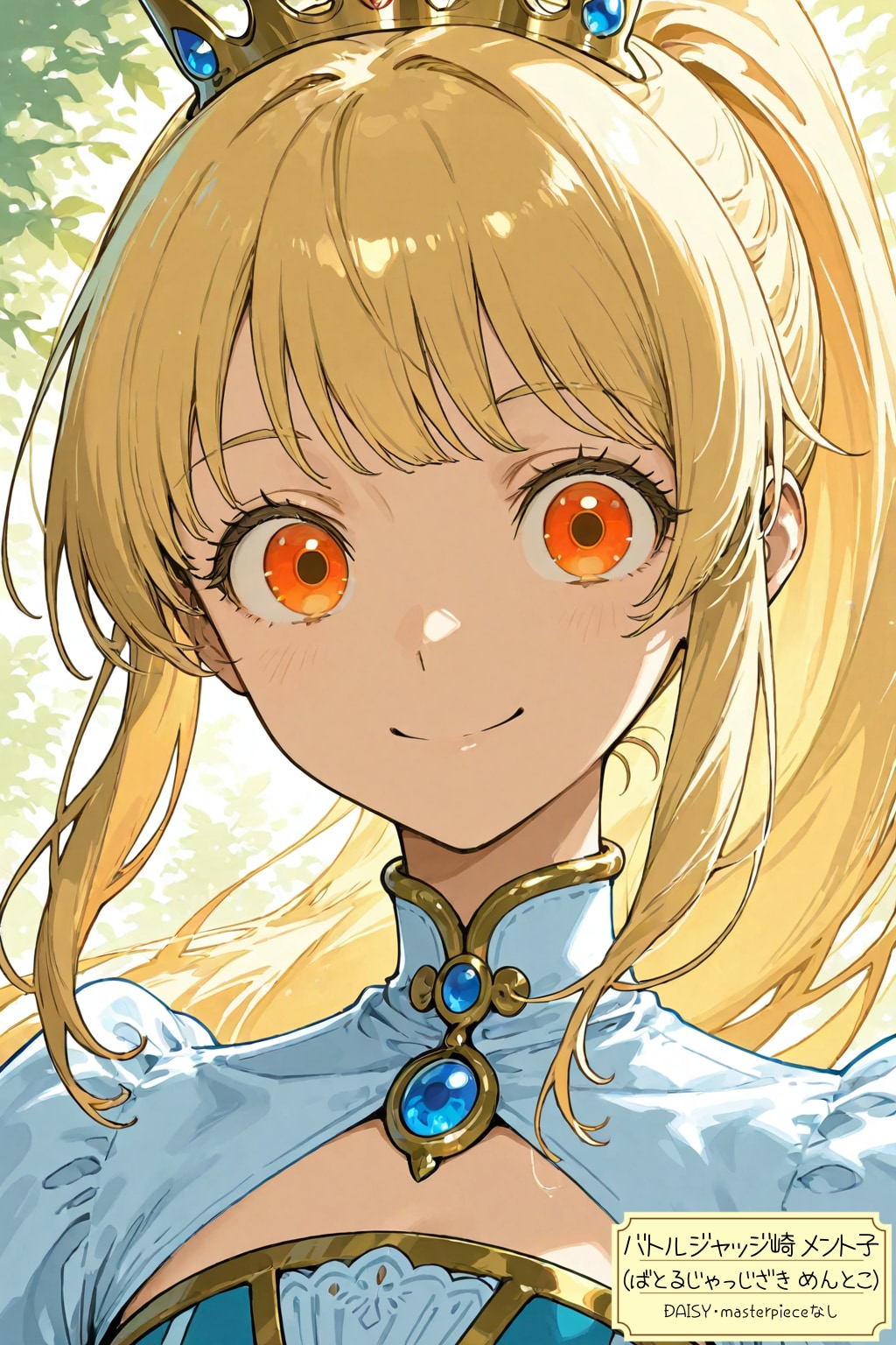 ponytail, blonde hair, orange eyes, round face, wide-set eyes