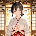 「A young Japanese shrine maiden with dark hair tied in a traditional style stands inside a serene Shinto shrine, bowing respectfully toward the viewer with her hands clasped together in a gesture of gratitude. She wears a white kosode (shrine maiden robe) with long, loose sleeves and a bright red hakama tied with a white sash. The shrine's wooden floor is polished and gleaming, with sunlight filtering through the lattice windows. Behind her, a large offering box and sacred rope decorations (shimenawa) frame the scene, with a faint glow from hanging lanterns casting a warm ambiance. Her expression is gentle and sincere, with slightly lowered eyes conveying humility. The atmosphere is peaceful and reverent, with hints of incense drifting through the air.」