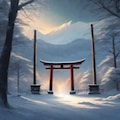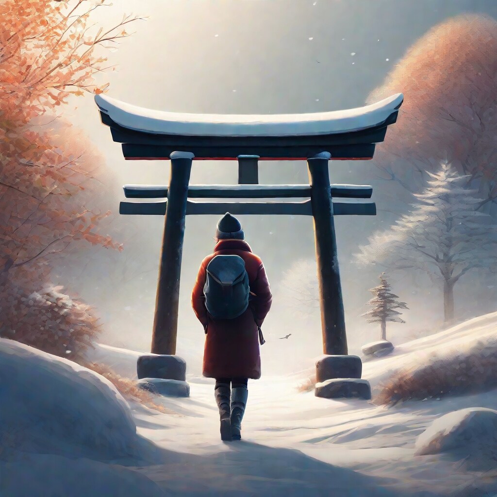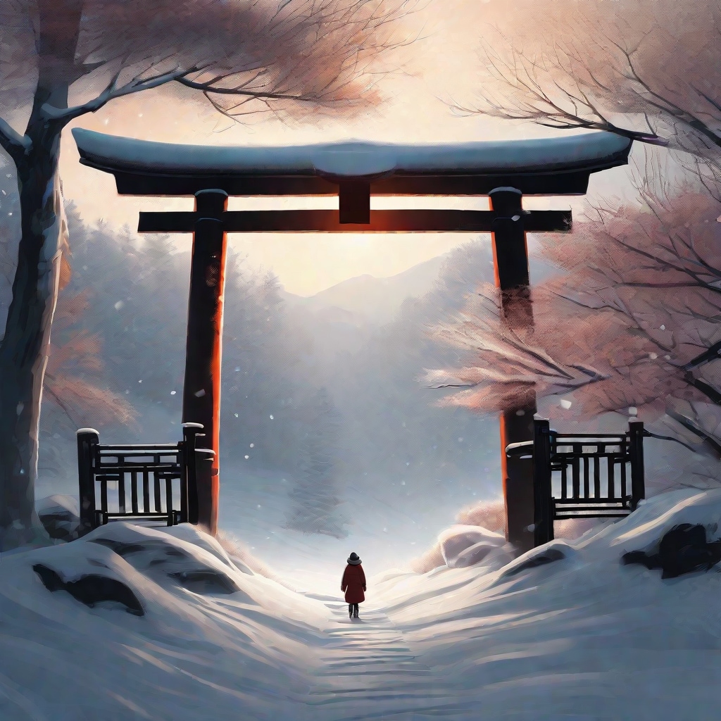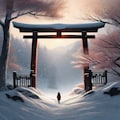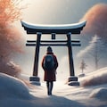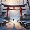 standing in front of a traditional Japanese torii gate, torii gate centered in the composition,
