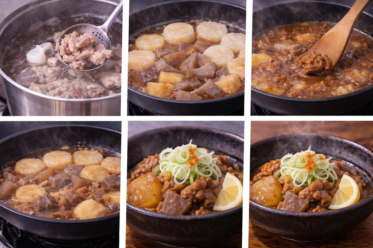 薬味が効く。ねぎの青い香りが、煮汁の濃さに抜け道を作る。七味は辛味というより、香りの線を引くためのものだ。ひと振りで後味が締まり、次の一口がまた新しくなる。レモンが添えられているなら、意外だが少し絞るのも悪くない。脂の余韻がすっと軽くなる。ただしやり過ぎは禁物で、煮込みのコクは残したい。