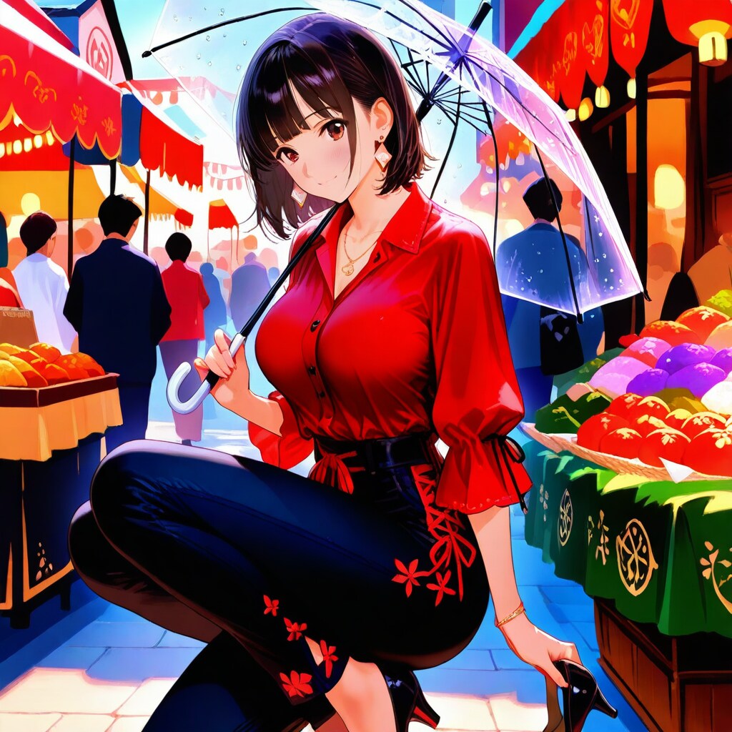 雰囲気的に、市場で働いている美人店員さんが、集客用にSNS映えしそうな画像を撮る為にポーズを取っている、っていう感じの一枚が出来ました