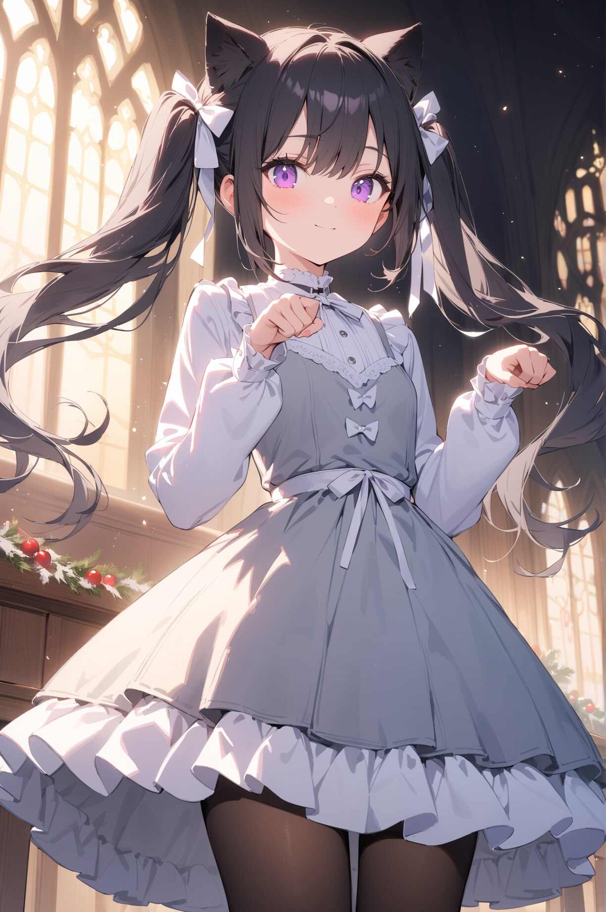 ・黒猫のイメージ通りカペラは黒っぽい服を着ていることが多く、晴天アポカリプスの絵でもいつも黒系のジャケットを着ています。異世界に着た後は衣装バリエーションを増やして黒以外も着るようにしています。今回もゴスロリと言えば基本は黒なのですが...クリスマスということで気分を変えてグレーにしてみました。