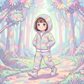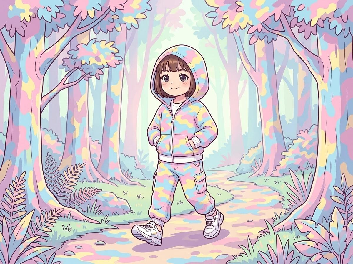 絵のちびちゃんがフードを被り迷彩と同じパステルカラーの森の小道を歩いている。