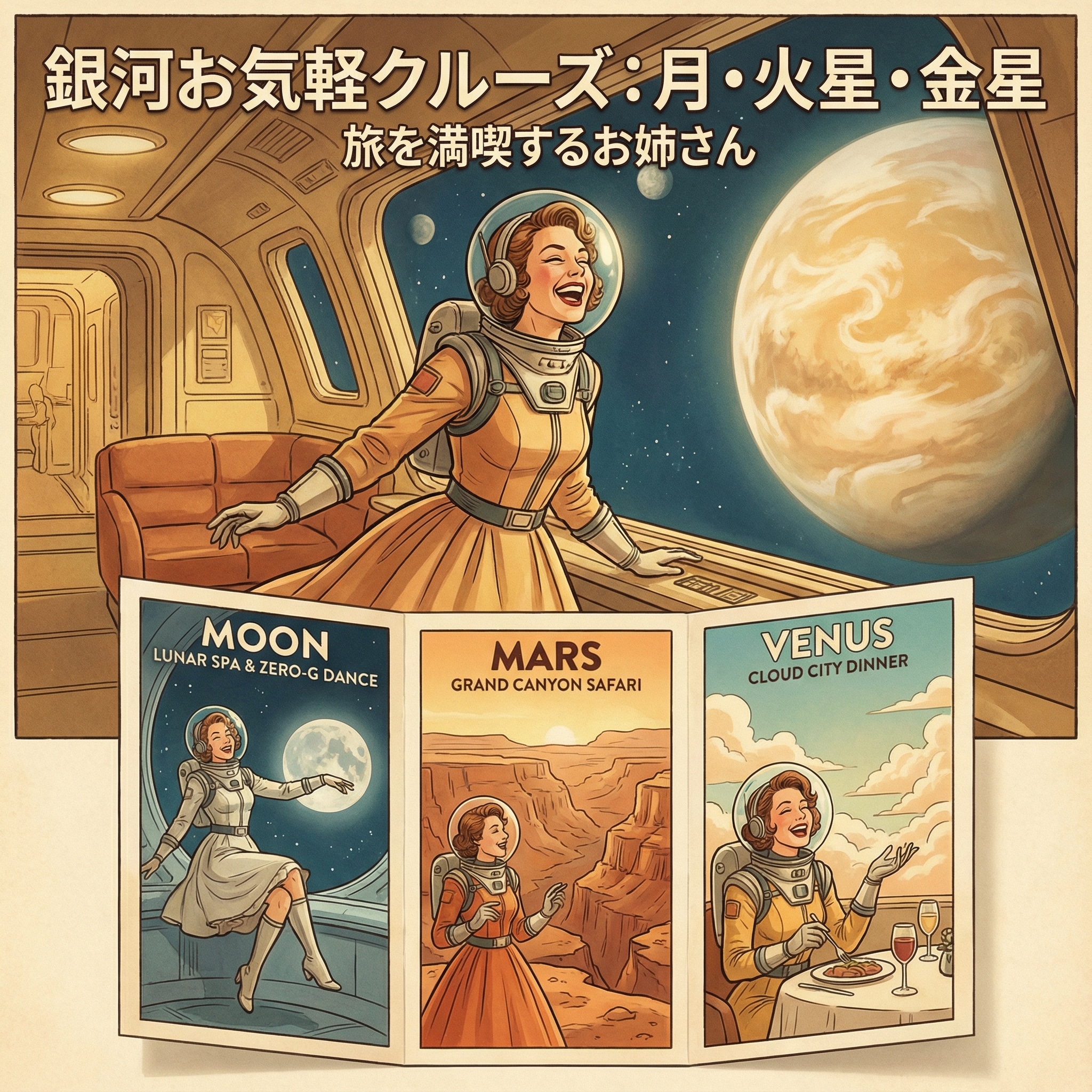 1950年代にもし宇宙旅行できていたらこんな感じだのパンフレットが旅行代理店に並んでいたかも。