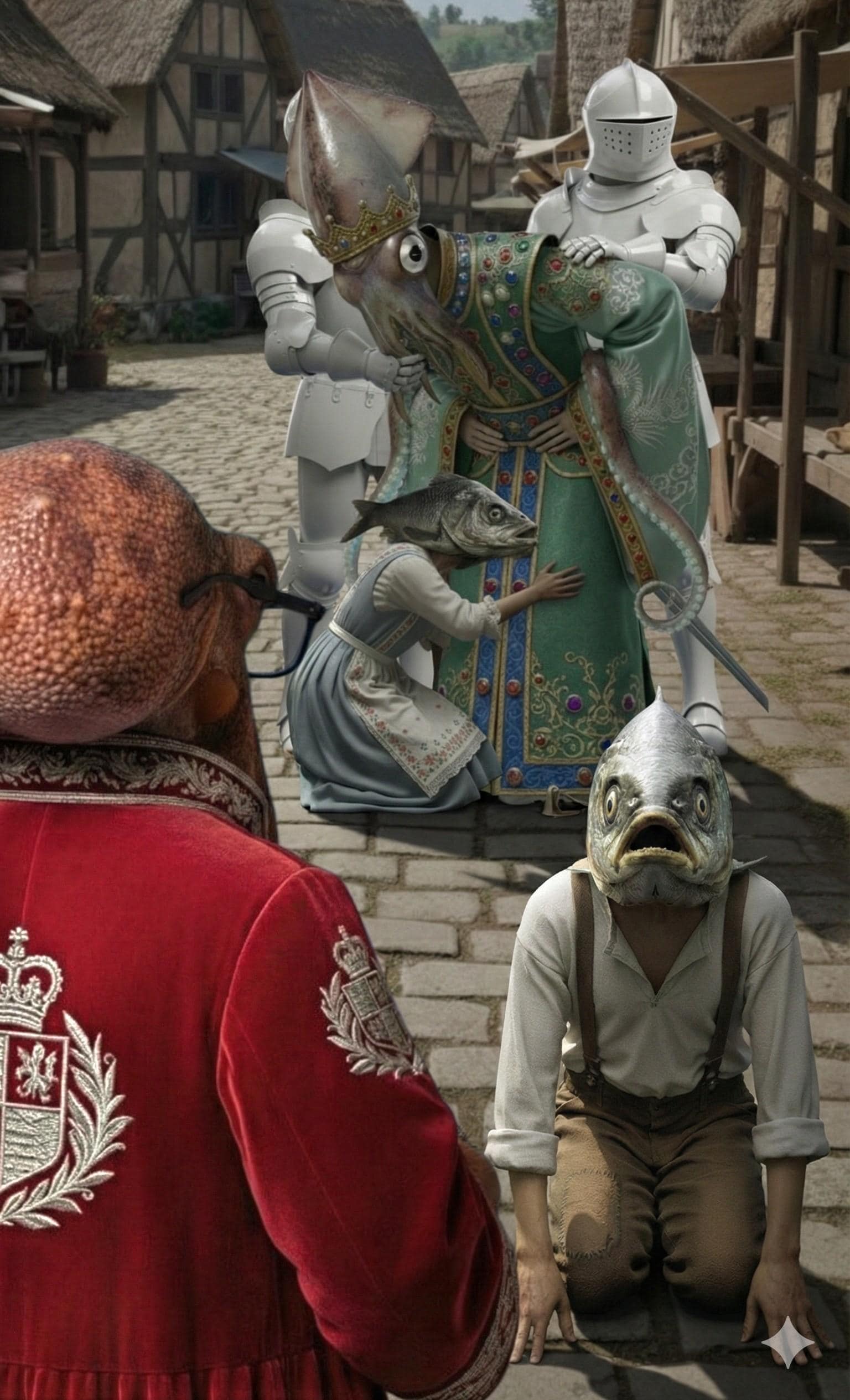 イルカ白騎士と娘は惹かれ合い、今日は結婚式。王を代行している蛸宰相だが、今後はイルカ白騎士に託す心積もり。