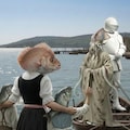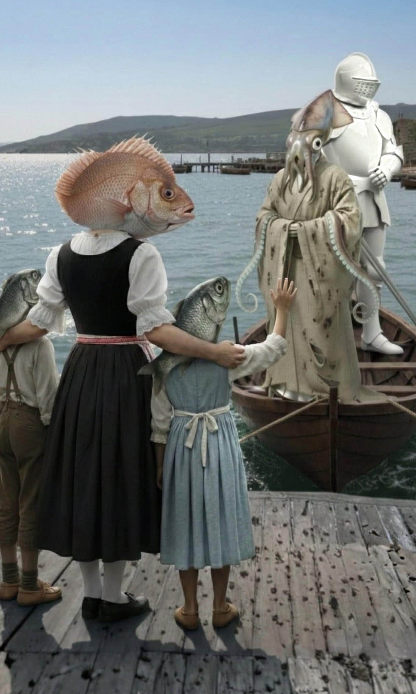 鰊兄妹の必死の嘆願で死罪を免れ流刑となった烏賊。兄妹を託された桜鯛娘と共に見送られる。