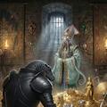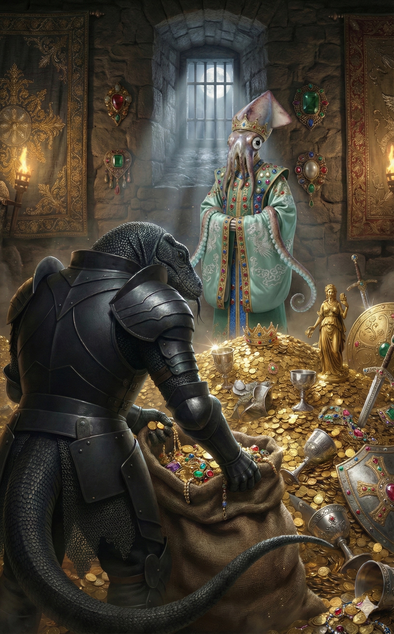 匿っていた黒蜥蜴騎士を高飛びさせるため、宝物庫へ連れ出す烏賊王。