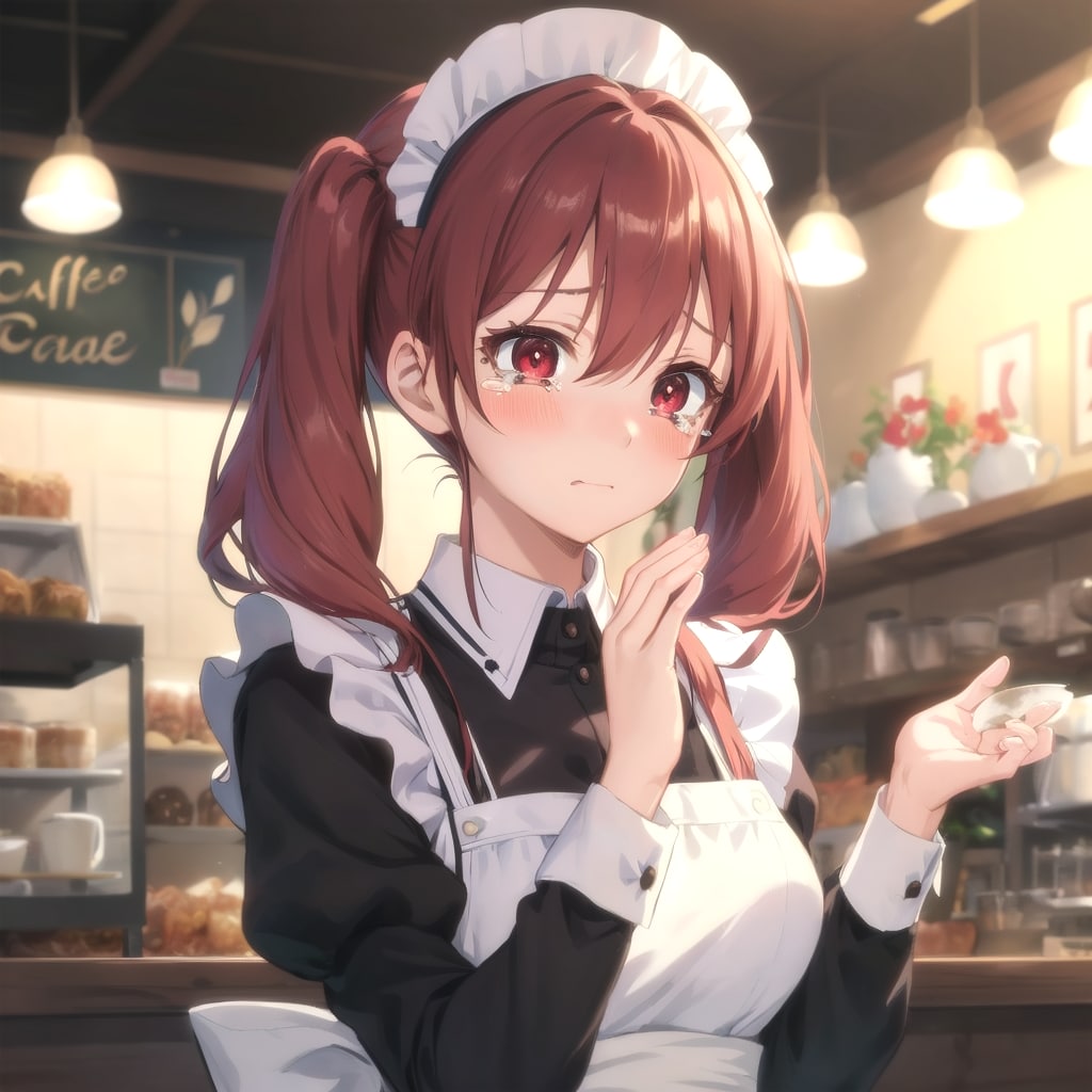 ◆自分のお店がメディアに取り上げられたメイドカフェ店長(特徴:赤い髪、ツインテール、赤色の目、30歳、胸が大きい、ぽっちゃり体系のアニメキャラ)は、テレビ局から「インタビュー」を受けています。
