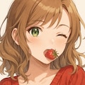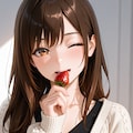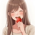 A girl holding a strawberry in her mouth while winking at the viewer,