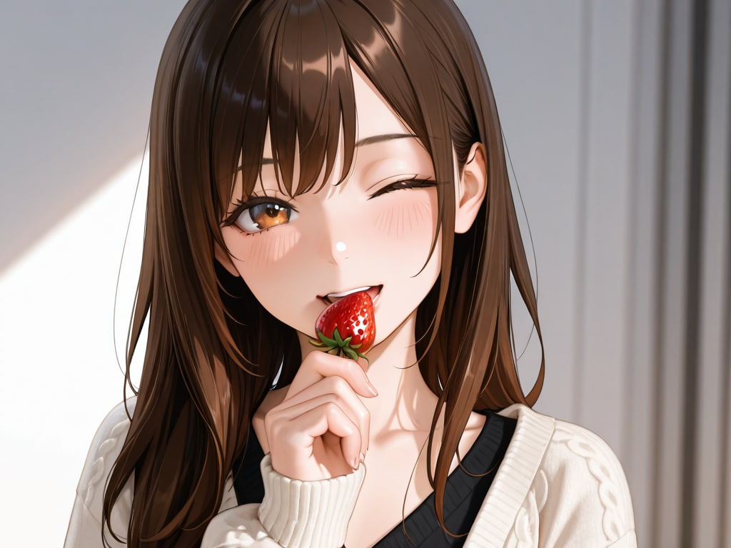Masterpiece, Best Quality, Amazing Quality, Very Aesthetic, High Resolution, Ultra-Detailed, Absurdres, Newest, Scenery, 3D, Rendered, General, Concept_Art, 1Girl, Solo, Aged_Up, Flat_Chest, Cardigan, Knit_Top, Bangs, Brown_Hair, Long_Hair, A girl holding a strawberry in her mouth while winking at the viewer, Simple_Background, White_Background, Cinematic_Lighting, BREAK, Depth_of_Field, Volumetric_Lighting,