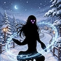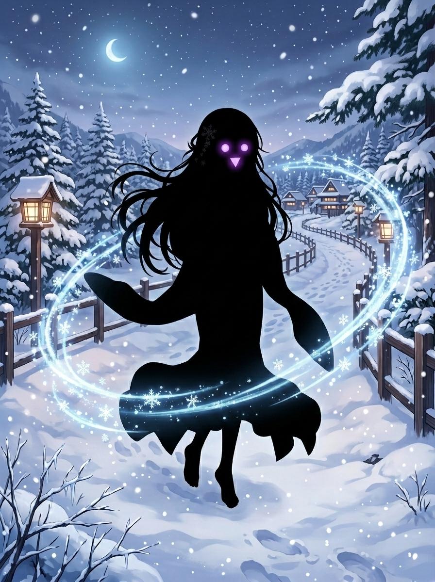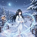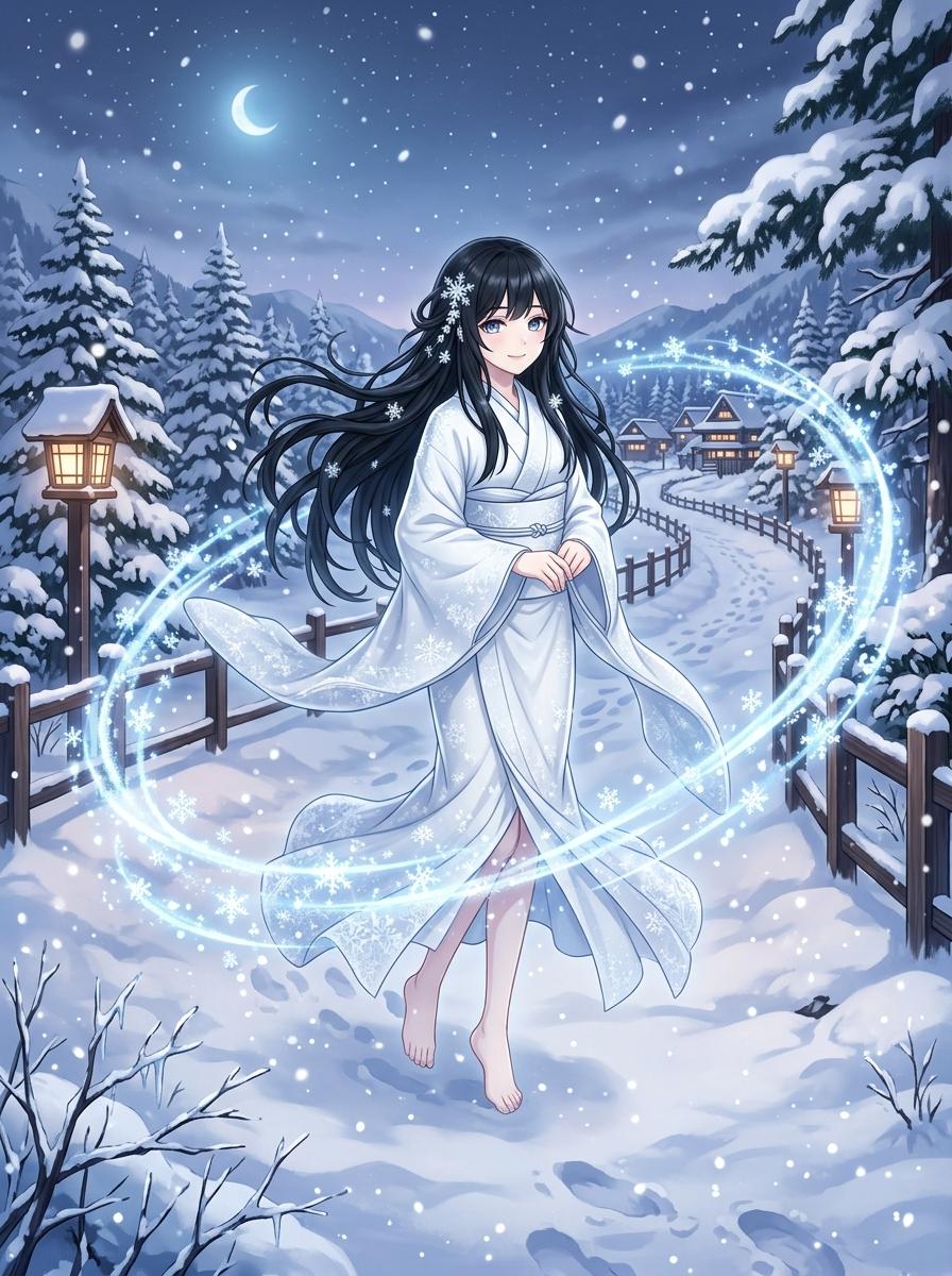 anime-illust, Yuki-onna, long tousled jet-black hair, white light kimono, gently smile, snowy path, A ring of snowflake particles swirled surround her body.