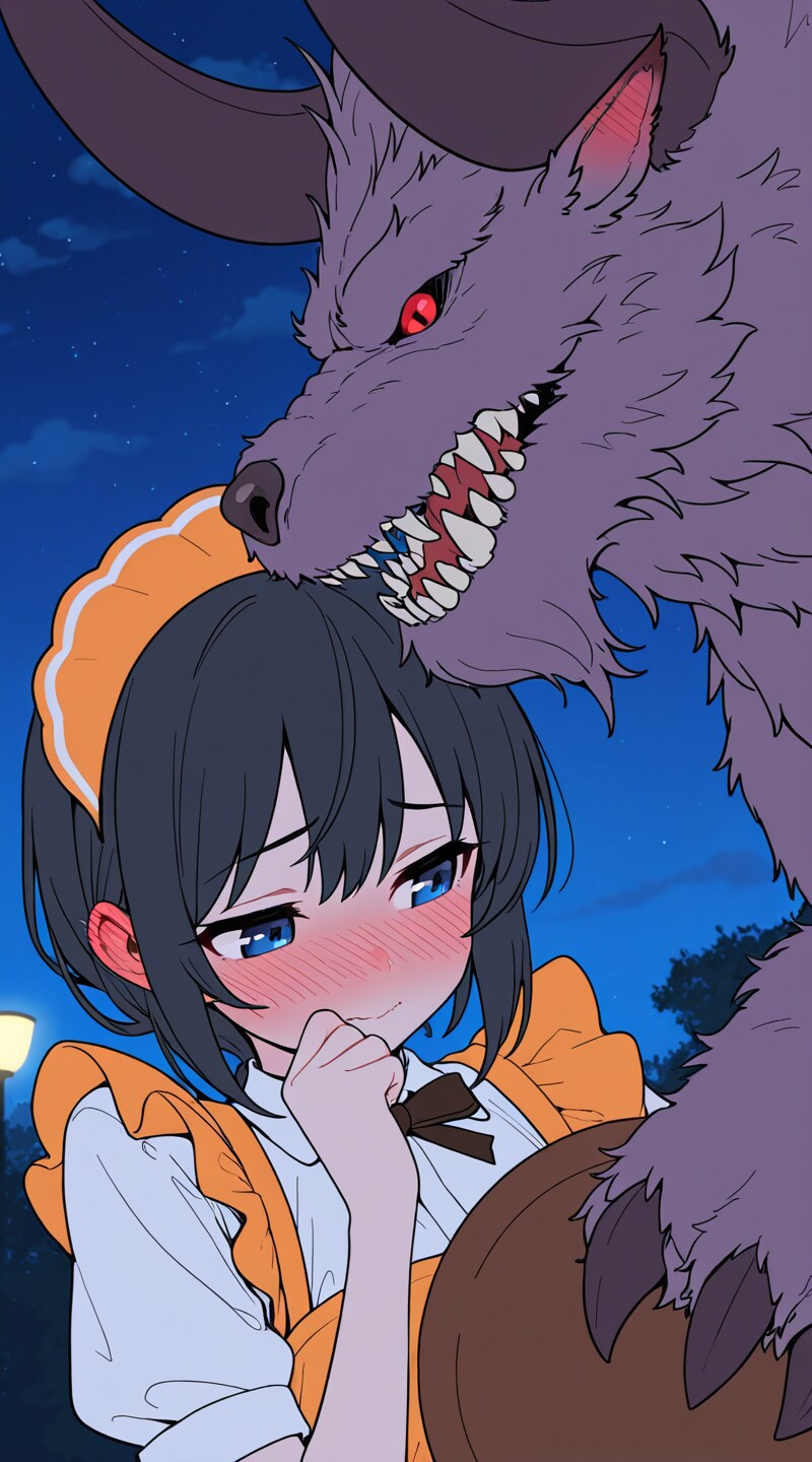 (flat color:1.5), (waitress girl:1.8), (nose blush, ear blush, embarrassed:1.4), (playing with behemoth:1.6), night, portrait