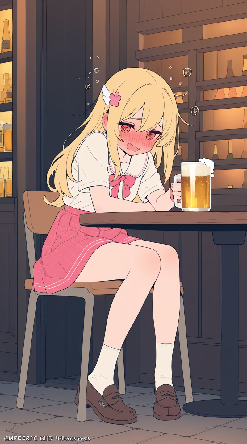 (flat color:1.5), (cinematic shot:1.5), (cute princess girl:1.2), (nose blush, @ @, embarrassed:1.4), shiny kiltie loafers, (drinking beer, drunk:1.4),