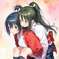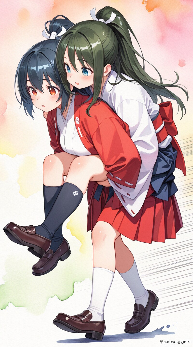 (beautiful samurai girls:1.4), high ponytail, shiny loafers, (piggyback:1.1), (speed lines:1.4), (watercolor background:1.6), depth of field,