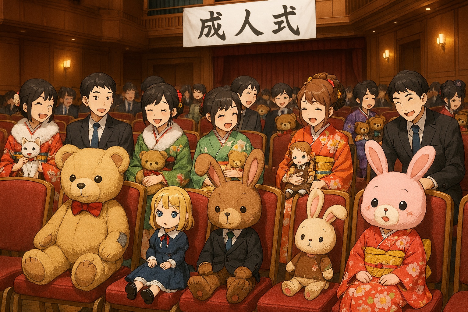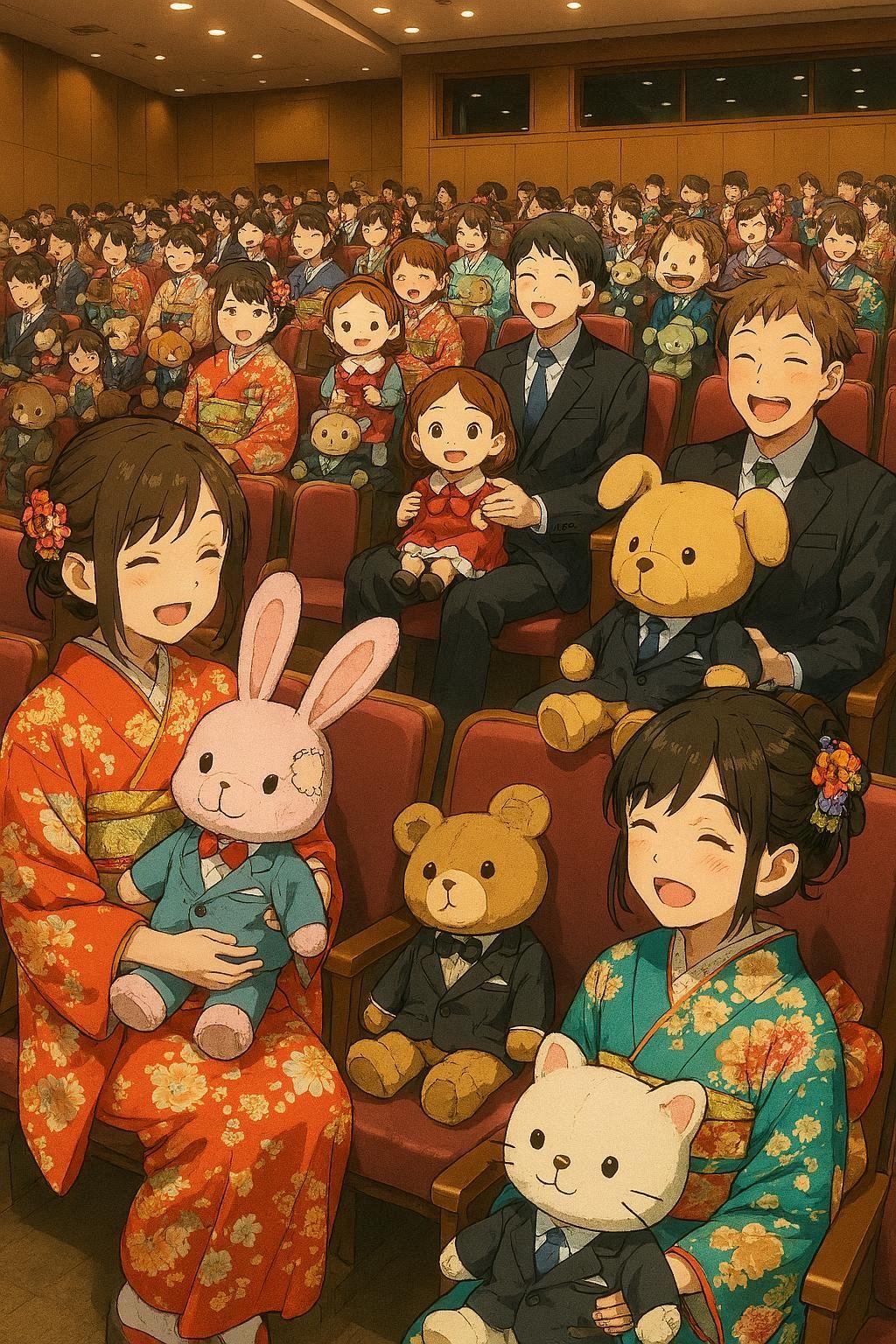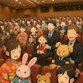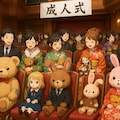 長く大切に使われたドールやぬいぐるみを持ち寄る集会を"成人式"と称して集まっている人達,