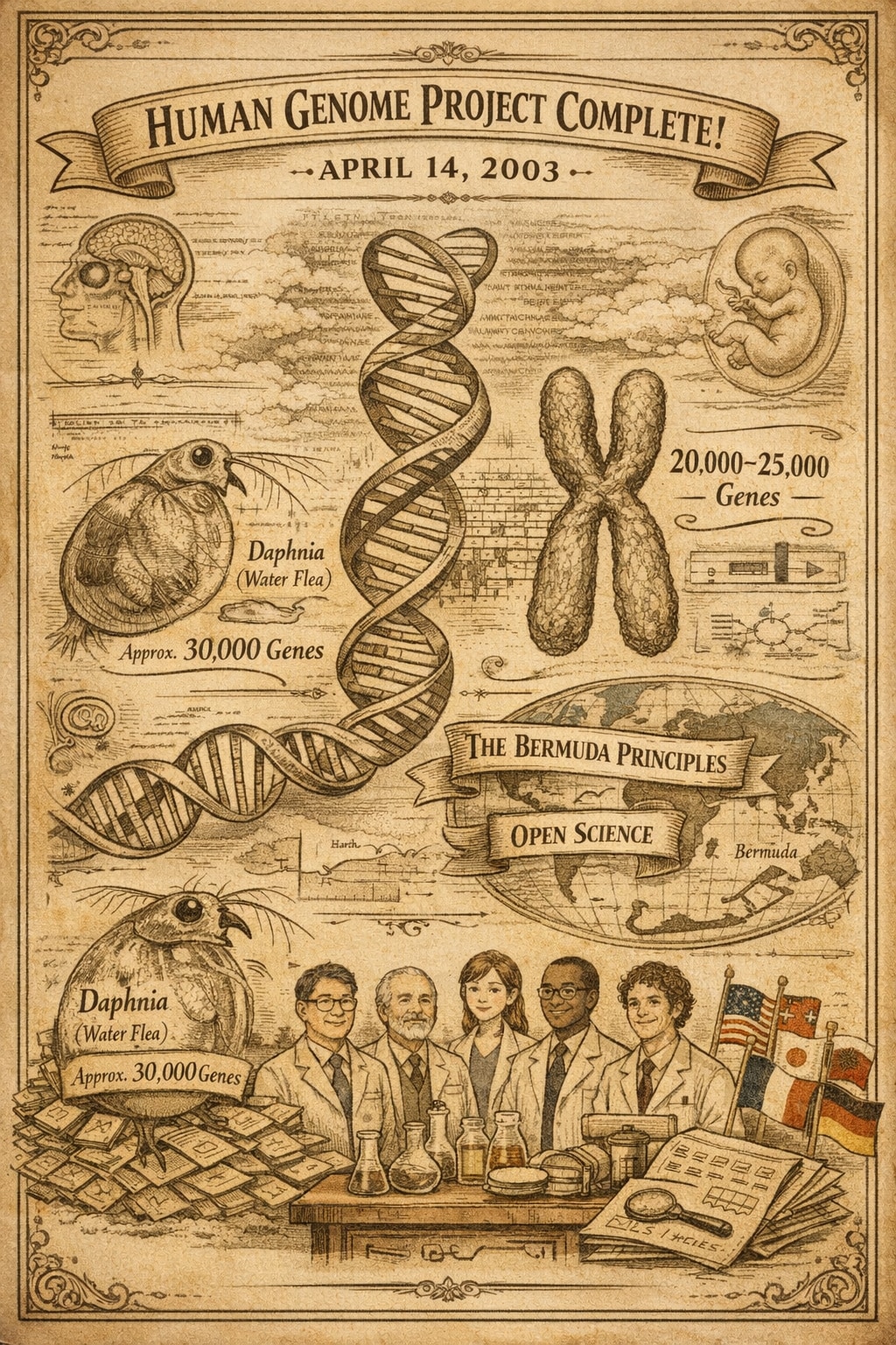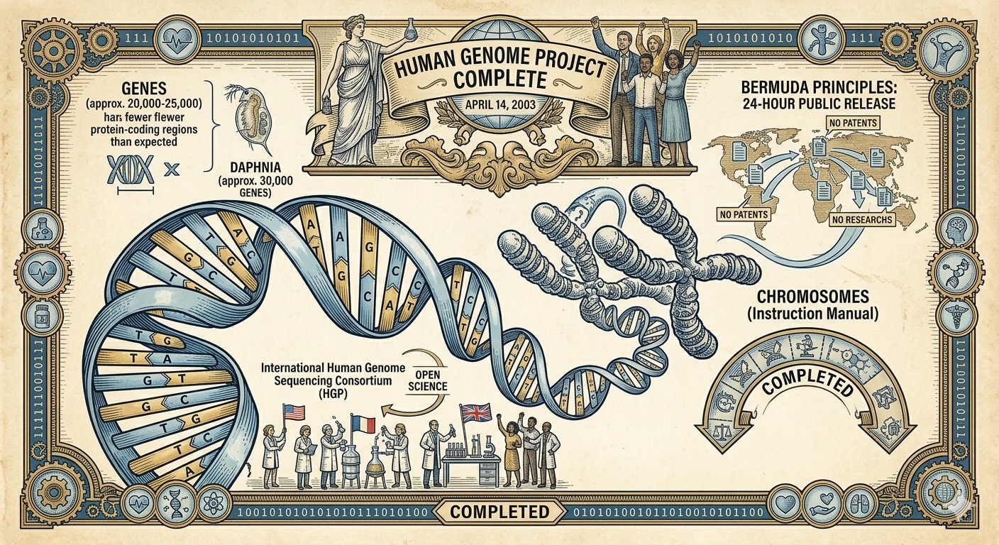 2003年4月14日、国際ヒトゲノム公的コンソーシアム(International Human Genome Sequencing Consortium: IHGSC)は、ヒトゲノム計画(Human Genome Project: HGP)の全工程が完了したことを正式に宣言した。本計画は、1990年に米国連邦政府主導で開始され、日本、英国、フランス、ドイツ、中国を含む国際共同プロジェクトとして展開された。当初の予定より2年早く完了したこの宣言は、生命の「設計図」の解読という生物学史上最大級の金字塔を打ち立てたものである。