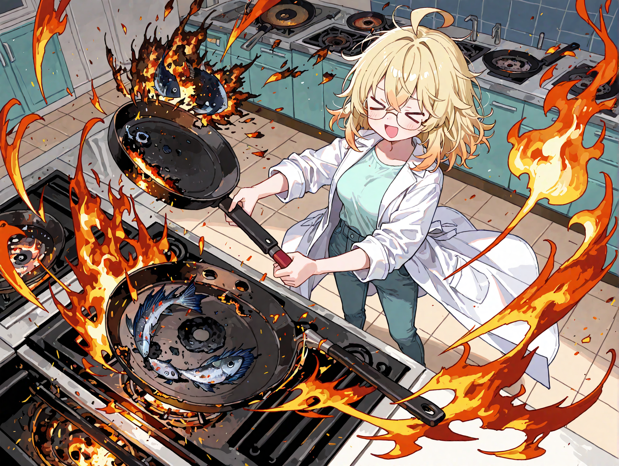 キッチン中に飛び散る味噌と魚の破片。