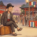 「神社の境内で革カバンを椅子代わりに寛ぐ中年男性」