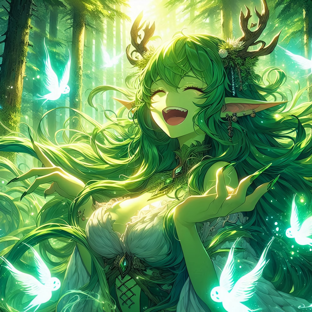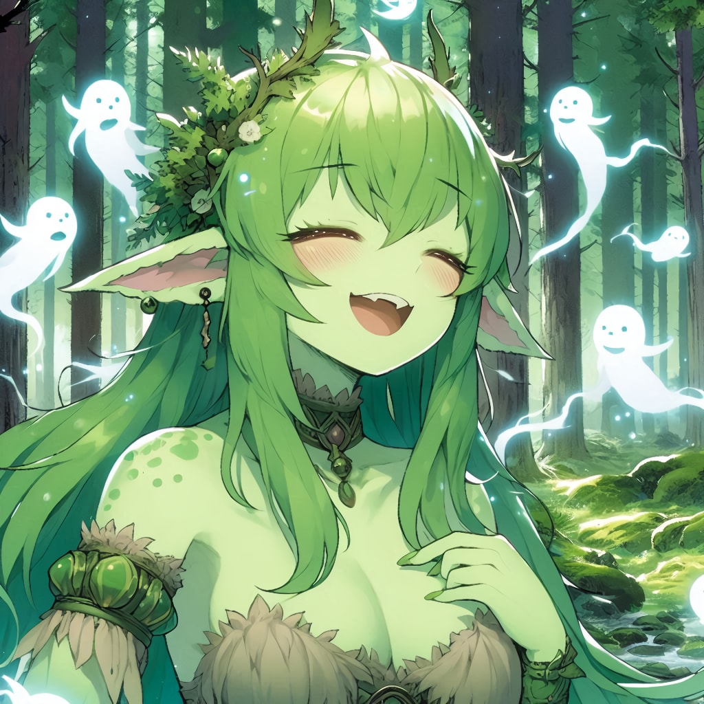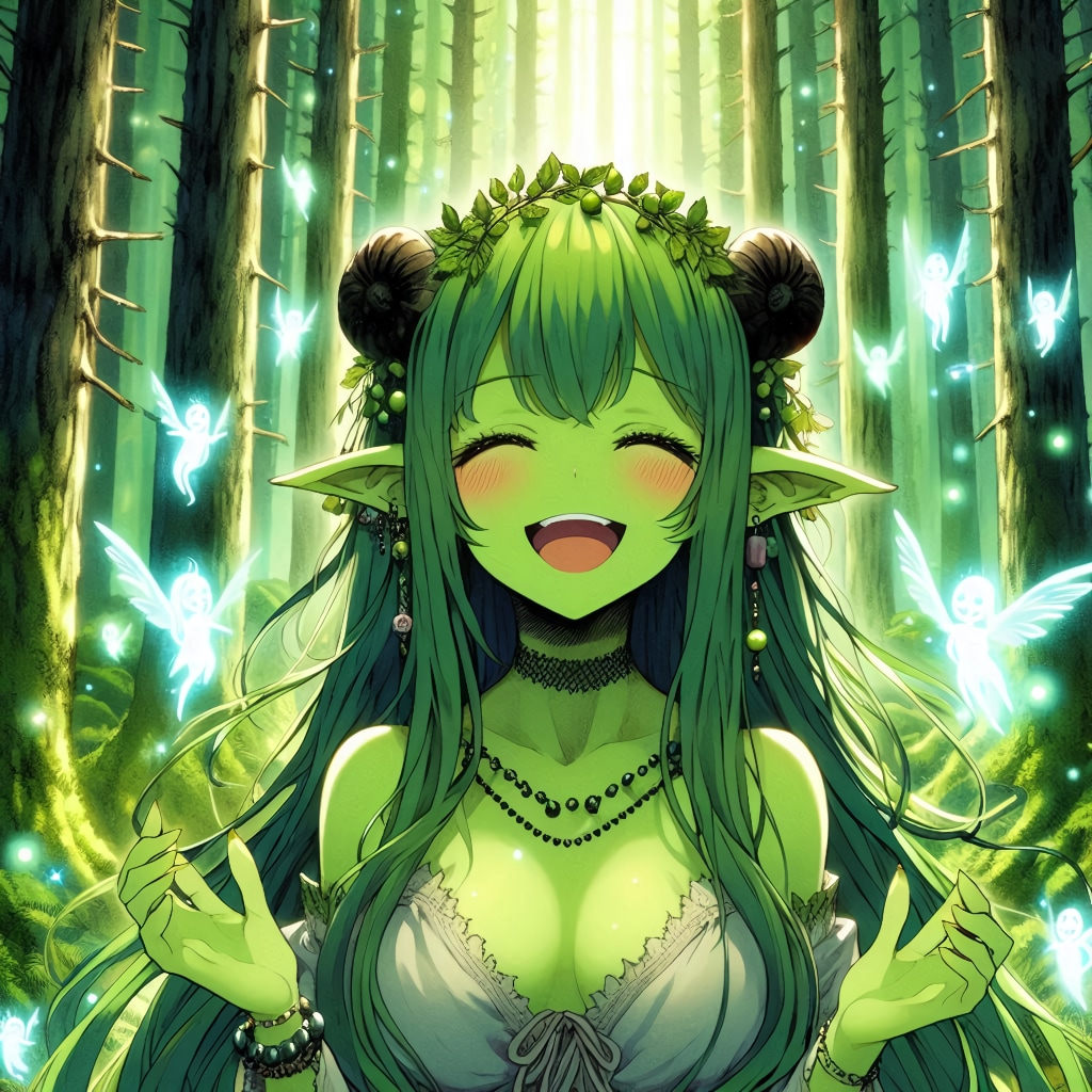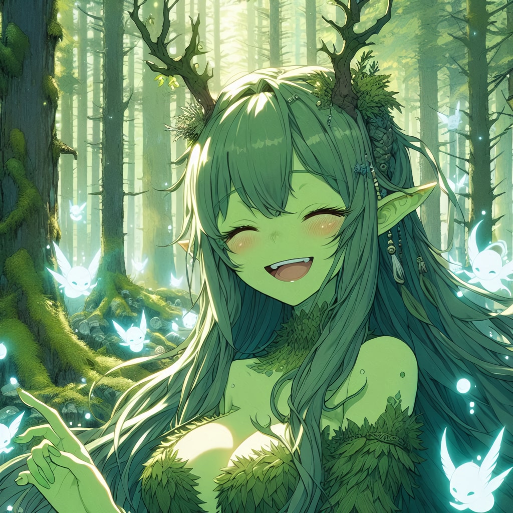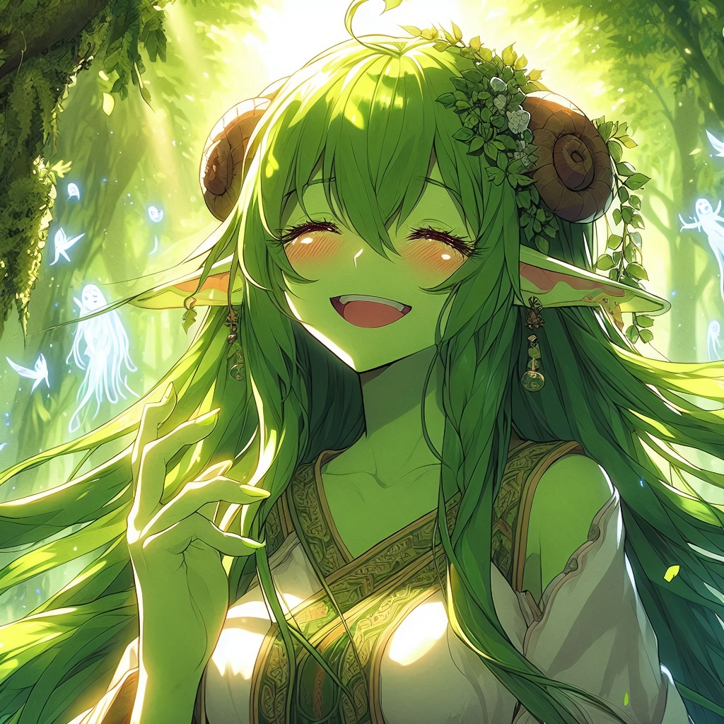 「緑肌のモンスター娘(ドライアド)が、大らかそうに微笑む、えっちぃ身体つきのお姉さんだったら?」