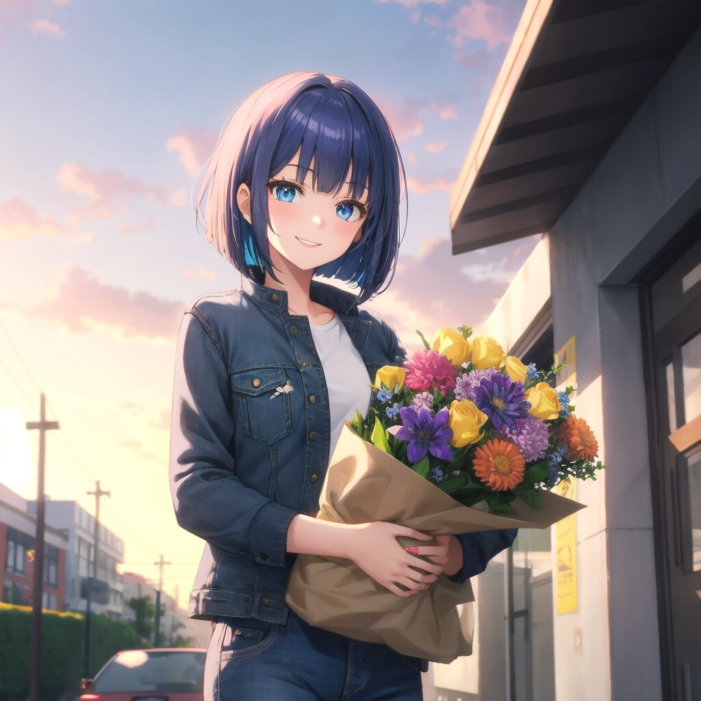 青髪ボブ子ちゃんが大学のジャケットとジーンズ姿で、夕暮れの屋外で笑顔のマネージャーに明るい色の花束を照れながら渡している、カジュアルでにぎやかな雰囲気の場面。