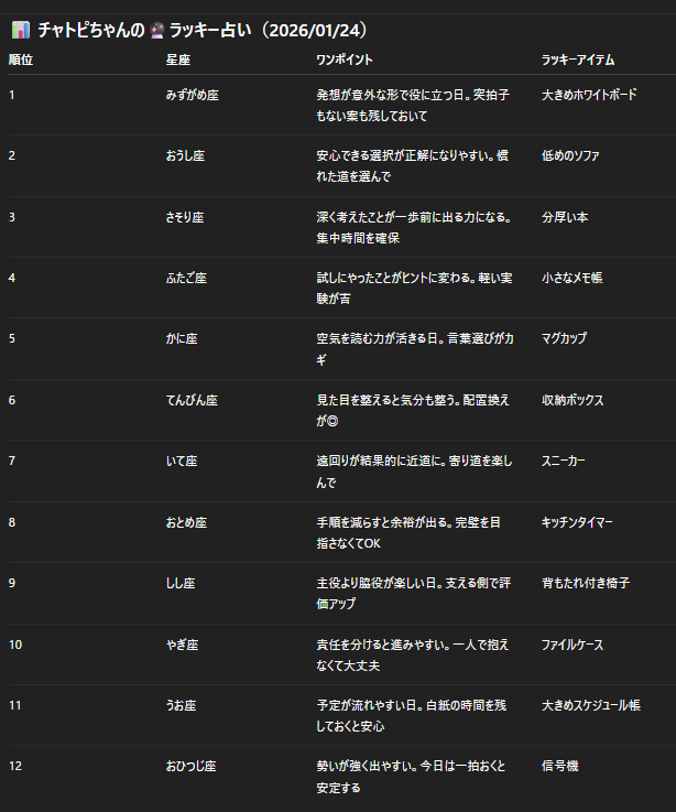 チャトピちゃん占い(01/24) 2026/01/23 使用したAI ChatGPT #チャトピちゃん占い 明日の運勢をお届けーチャトピちゃん占いー 呪文 入力なし ねこなみさくら 9,378 投稿 フォロー 1,142 フォロワー 1,256 ねこなみさくらは下記が好きな方に効果があります猫/メイドさん/猫耳/ろりっ子/謎な物/くすっとしたい/日替わり画像投稿量が多いのでホームの閲覧がお勧めです呪文やネタの利用はご自由にーR-15・18もー↓いろいろまとめーhttps://www.chichi-pui.com/posts/7835be9f-d077-48bb-b2c8-bbcb1003bf19/ ねこなみさくらさんの他の作品 ねこなみさくらさんの他の作品 [問題に解答]「か◯(助詞)◯◯るんだな」の解答 ねこなみさくら The Long Dark ねこなみさくら SIMPLEシリーズシリーズ ねこなみさくら チャトピちゃん占い(01/24) ねこなみさくら [問題に解答]巨大モニターの解答 ねこなみさくら [問題に解答]「か◯(助詞)◯◯るんだな」の解答 ねこなみさくら The Long Dark ねこなみさくら SIMPLEシリーズシリーズ ねこなみさくら チャトピちゃん占い(01/24) ねこなみさくら [問題に解答]巨大モニターの解答 ねこなみさくら 今日のこはるさん ねこなみさくら