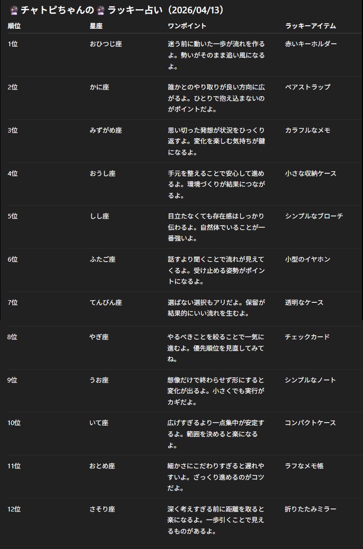 チャトピちゃん占い(04/13) 2026/04/12 使用したAI ChatGPT #チャトピちゃん占い 明日の運勢をお届けーチャトピちゃん占いー 呪文 入力なし ねこなみさくら 10,251 投稿 フォロー 1,252 フォロワー 1,366 ねこなみさくらは下記が好きな方に効果があります猫/メイドさん/猫耳/ろりっ子/謎な物/くすっとしたい/日替わり画像投稿量が多いのでホームの閲覧がお勧めです呪文やネタの利用はご自由にーR-15・18もー↓いろいろまとめーhttps://www.chichi-pui.com/posts/7835be9f-d077-48bb-b2c8-bbcb1003bf19/ ねこなみさくらさんの他の作品 ねこなみさくらさんの他の作品 きょうのオムライス(04/17) ねこなみさくら てててー、てってててー(04/17) ねこなみさくら 04/13でチャトピちゃん占い1周年だったー ねこなみさくら チャトピちゃん占い(04/17) ねこなみさくら 日付を入れてみる 04/16 ねこなみさくら きょうのオムライス(04/17) ねこなみさくら てててー、てってててー(04/17) ねこなみさくら 04/13でチャトピちゃん占い1周年だったー ねこなみさくら チャトピちゃん占い(04/17) ねこなみさくら 日付を入れてみる 04/16 ねこなみさくら 実践ミラさん ねこなみさくら