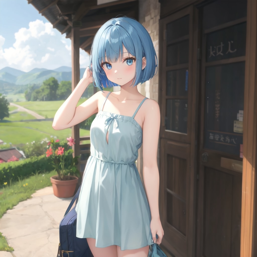 ②彼女はパステルカラーのワンピースを着て親戚の家を訪問します。彼女がそこに着て行く衣装は柔らかい色合いが青髪とマッチし、夏の暑い時期に涼しげで快適な装いとなります。