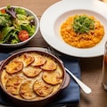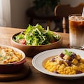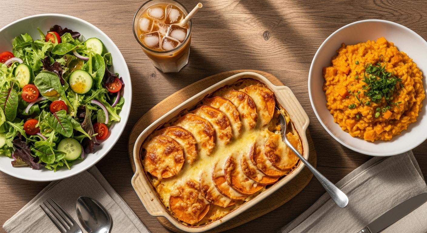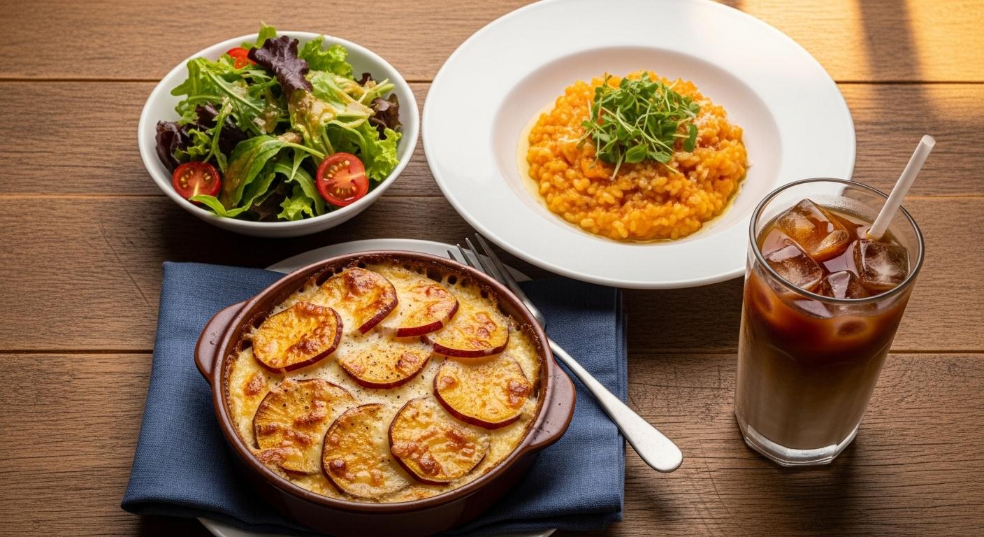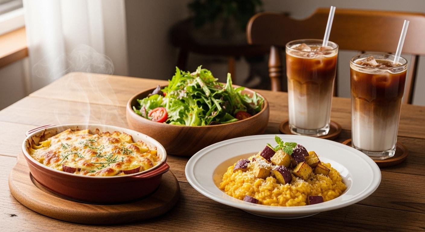 本日のメニューは、10月23日は「おいもほりの日」らしく、さつまいもグラタン、さつまいもリゾット、サラダのセットで御座います。