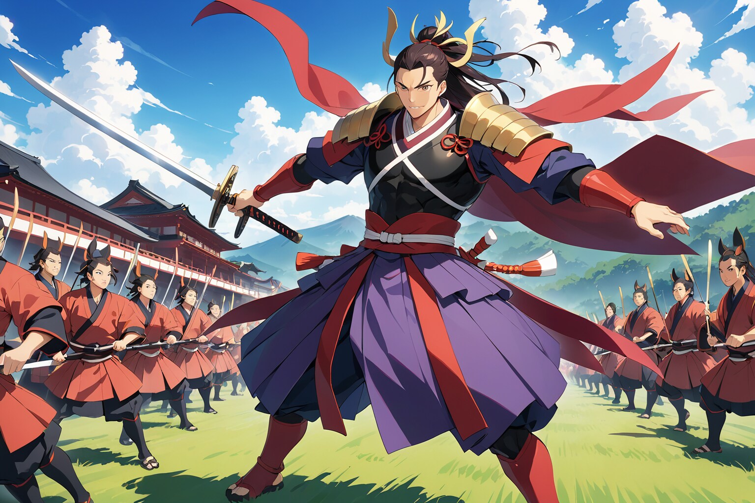 広がる青空と白い雲、どこまでも続く草原の中に、赤い装束に身を包んだ兵士たちが整然と並ぶ。その先頭には、一人の青年武士が立ち、威風堂々とした姿を見せつけている。金色の瞳が太陽の光を受けて鋭く輝き、黒髪の長髪が風に舞う。黒と金の鎧に身を固めた彼は、右手に刀を握りながら、両手を広げて大軍勢を掌握していることを誇示するかのようだ。その唇には自信に満ちた笑みが浮かび、にやりと人を挑発するような表情を浮かべている。将門の背後には、静かにして無限の力を秘めた軍勢――この地の覇権を握る覚悟が、彼の姿に全て宿っている。