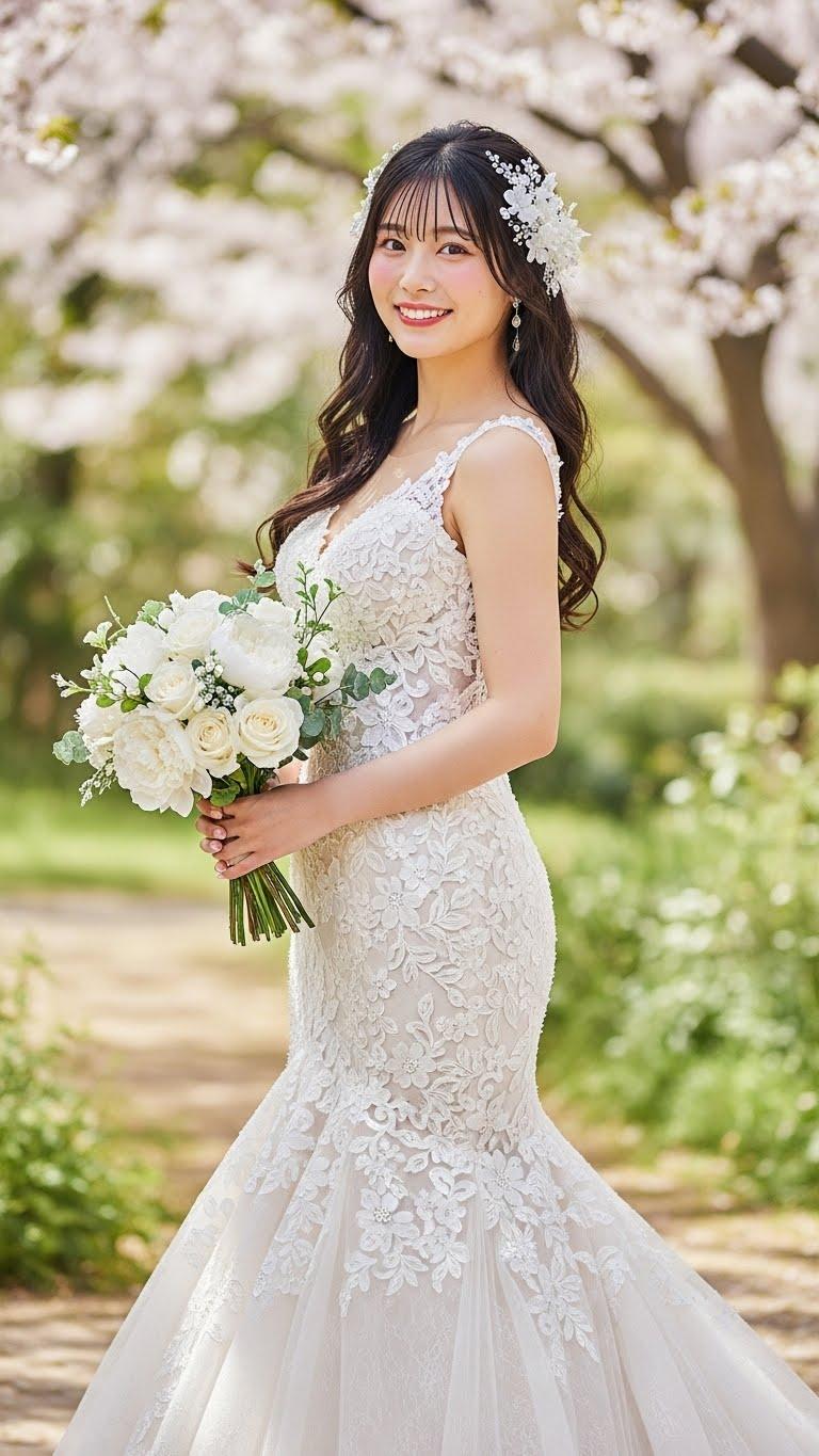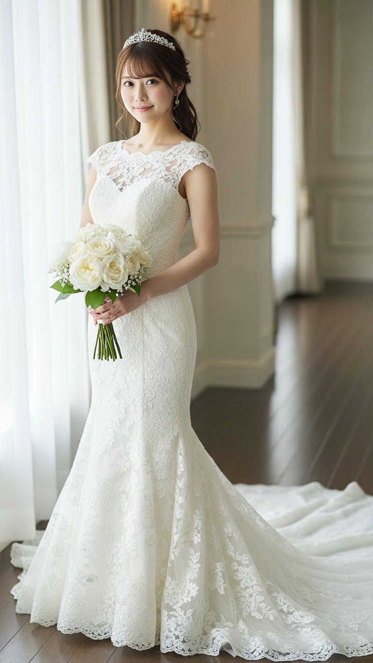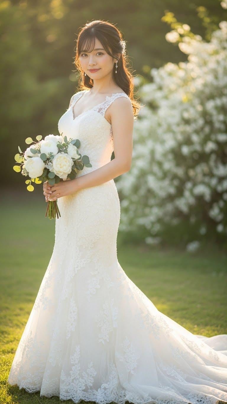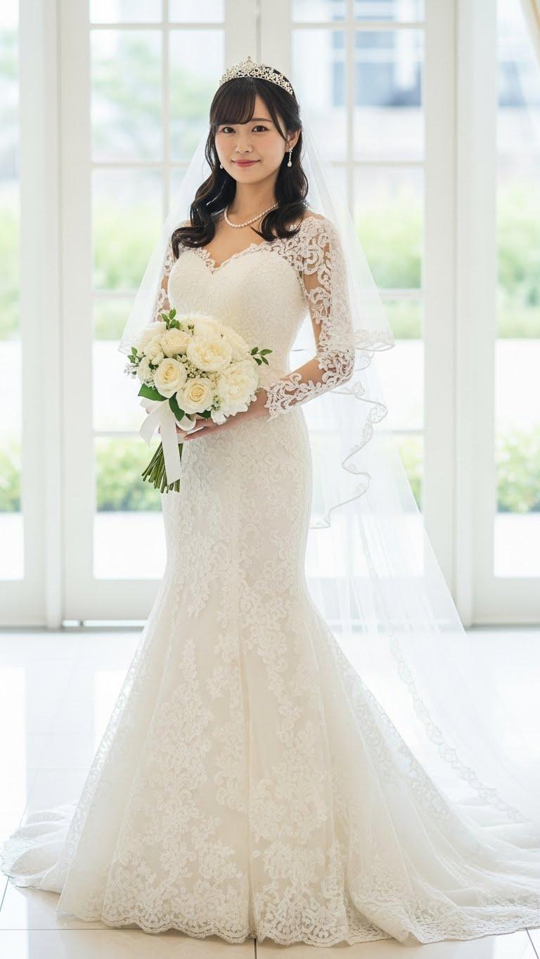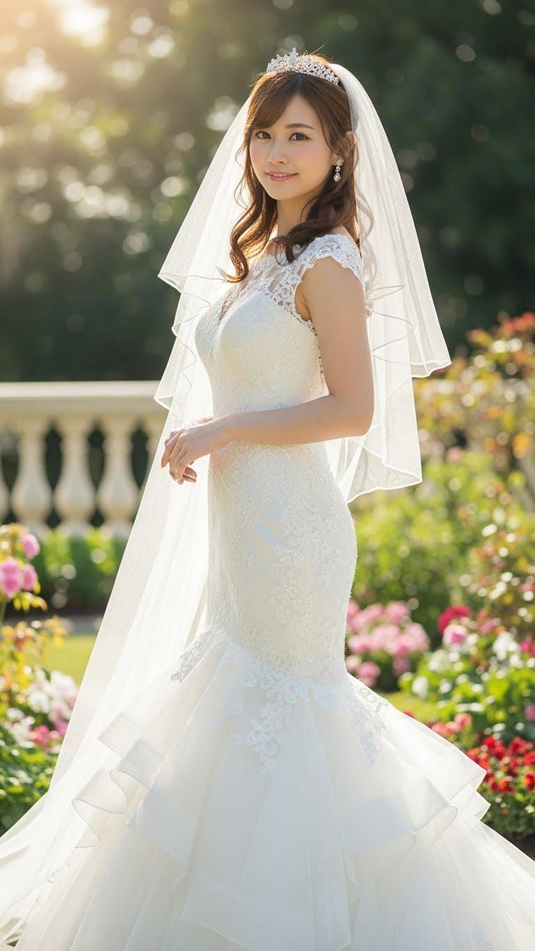 マーメイドラインのウェディングドレスを着用した美しい日本人の可愛い女の子のリアルフォトを作って。