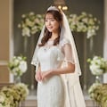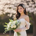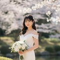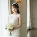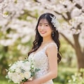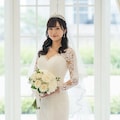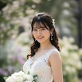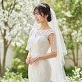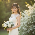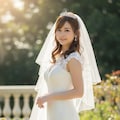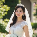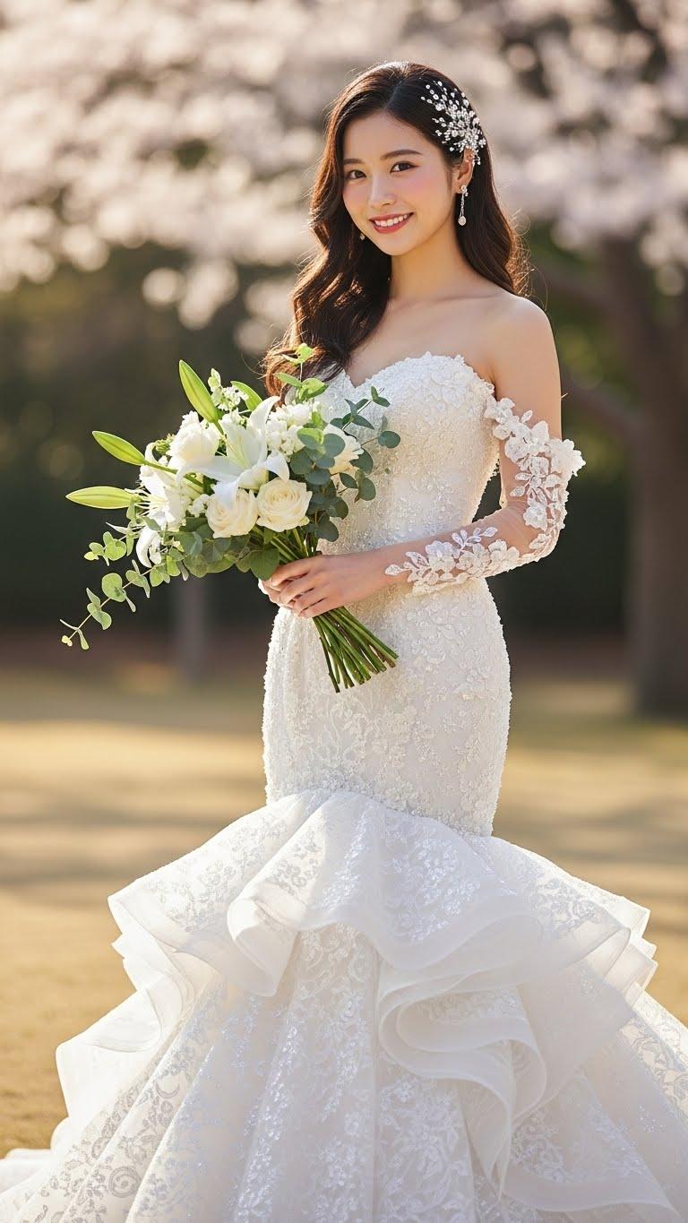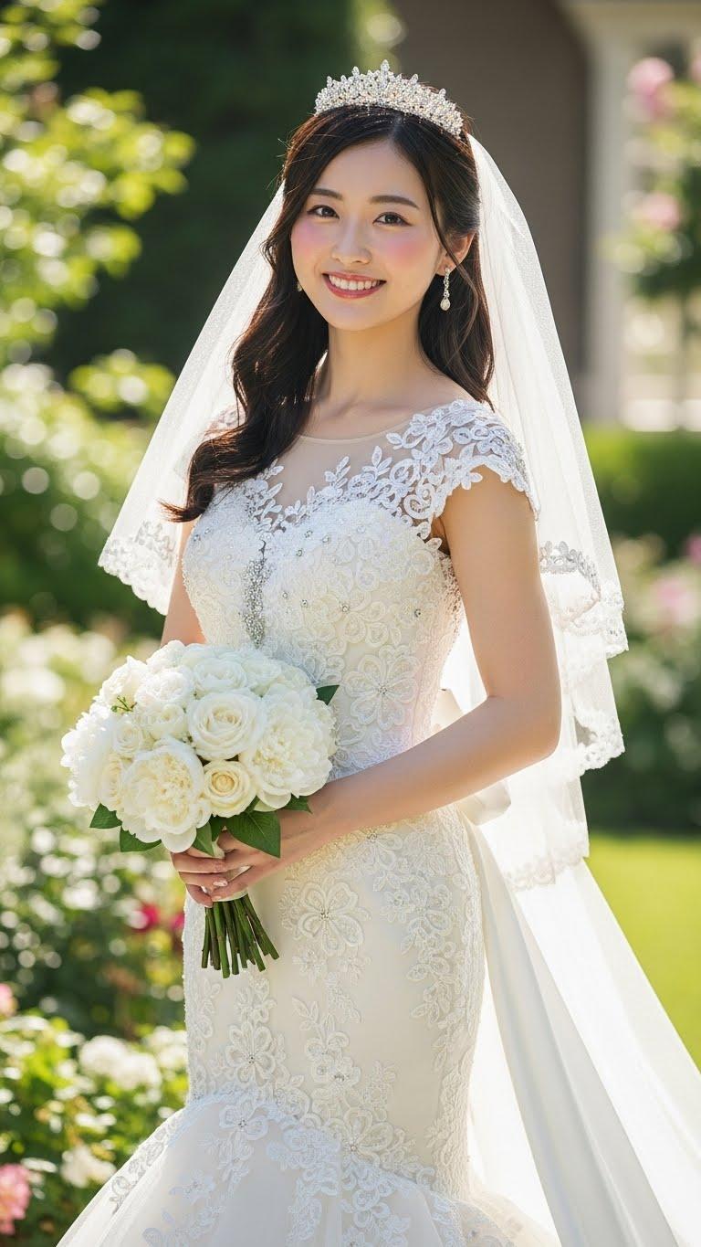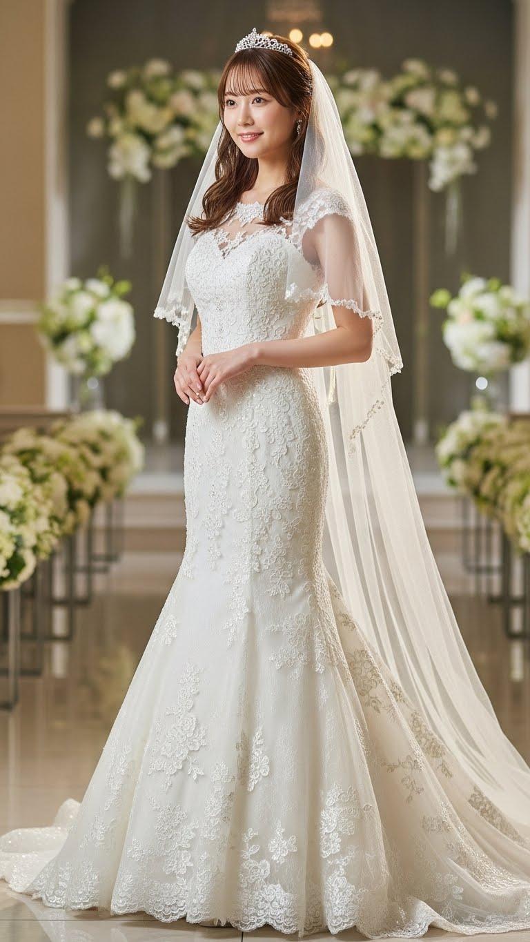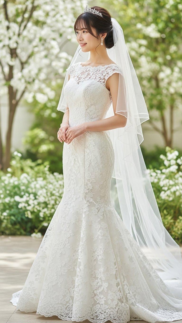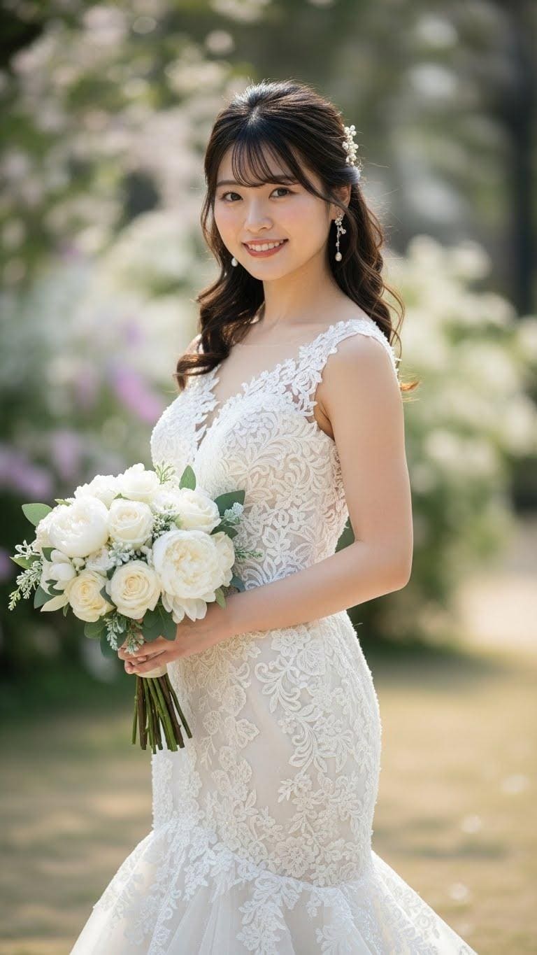 マーメイドラインのウェディングドレスを着用した美しい日本人の可愛い女の子のリアルフォトを作って。