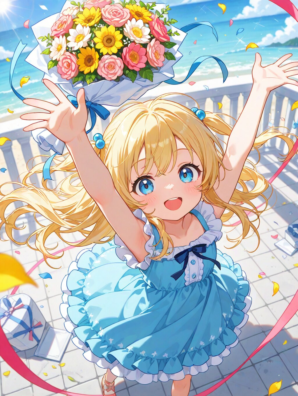 花束が舞い上がり、温かな祝福を届ける