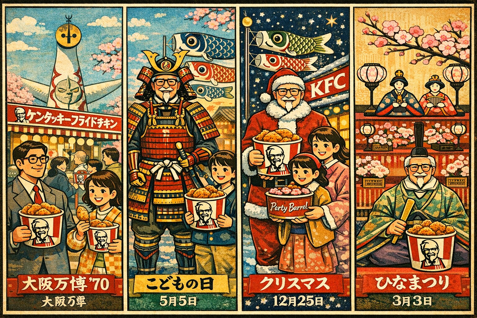 ここでの成功が突破口となり、さらに「銀座店」の成功、そして1974年から始まる伝説のキャンペーン**「クリスマスはケンタッキー」**へと繋がっていきます。