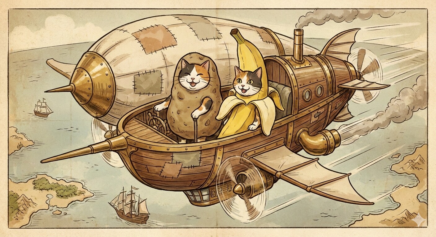 ニャガサキのニャウンゼン市でお茶をし、それから、蒸気飛行機に乗って、バナにゃんさんの故郷へ向かった次第です。
