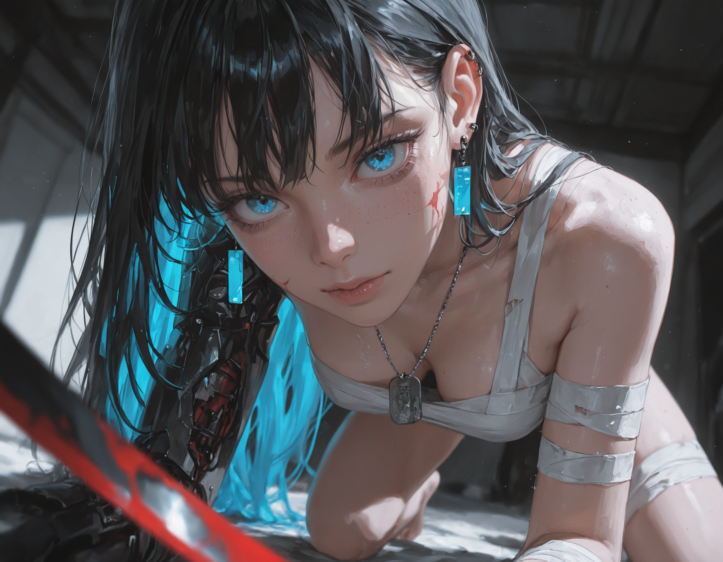 jacket partially removed, heart in eye, burnt clothes, holding fishing rod, kanji, doujin cover, pentagram, tape gag, adjusting headwear, red socks, friends, cloud print, coke-bottle glasses, oral invitation, competition school swimsuit, barbell piercing, gradient legwear, prisoner, blood on breasts, wind chime, carrying over shoulder, tape measure, flaming weapon